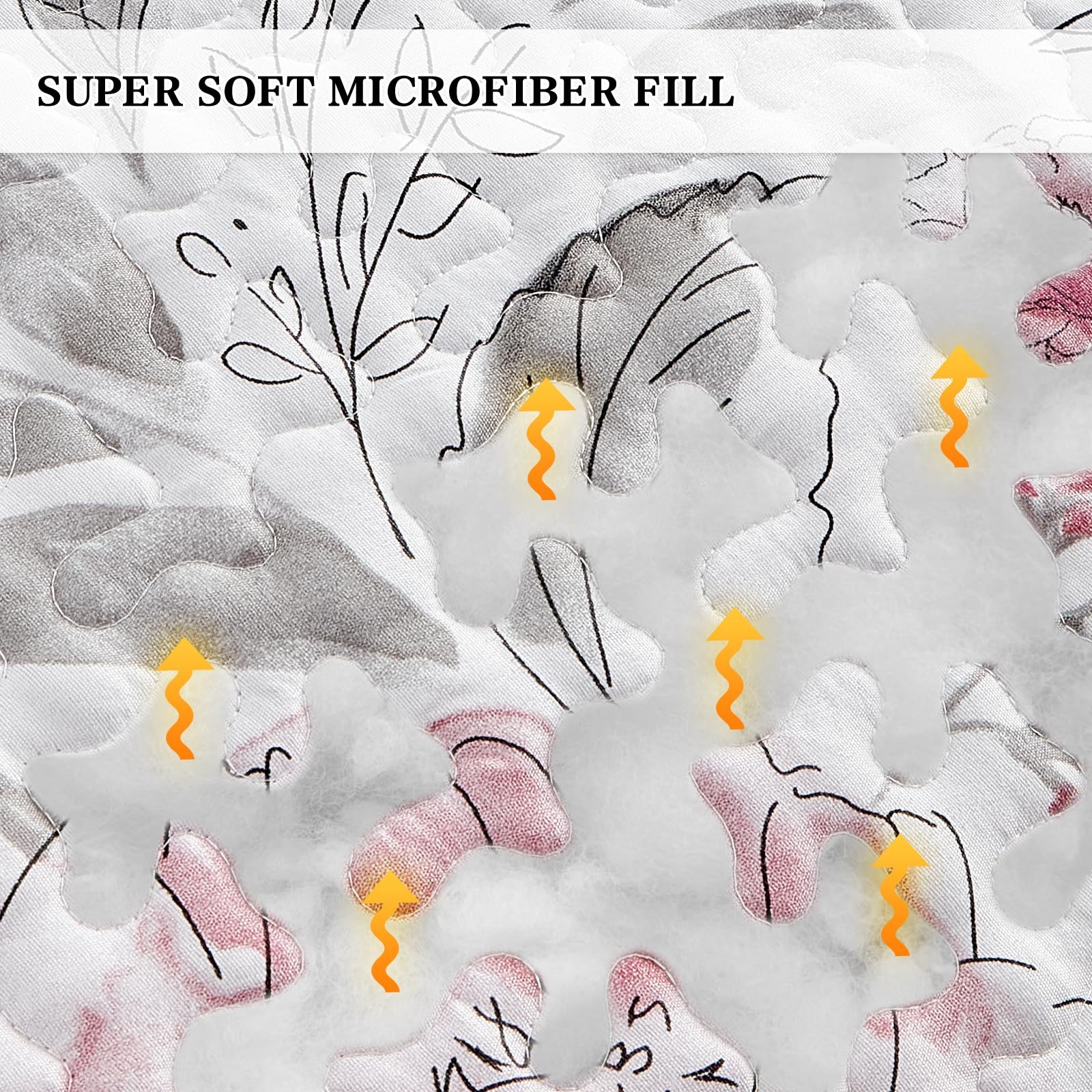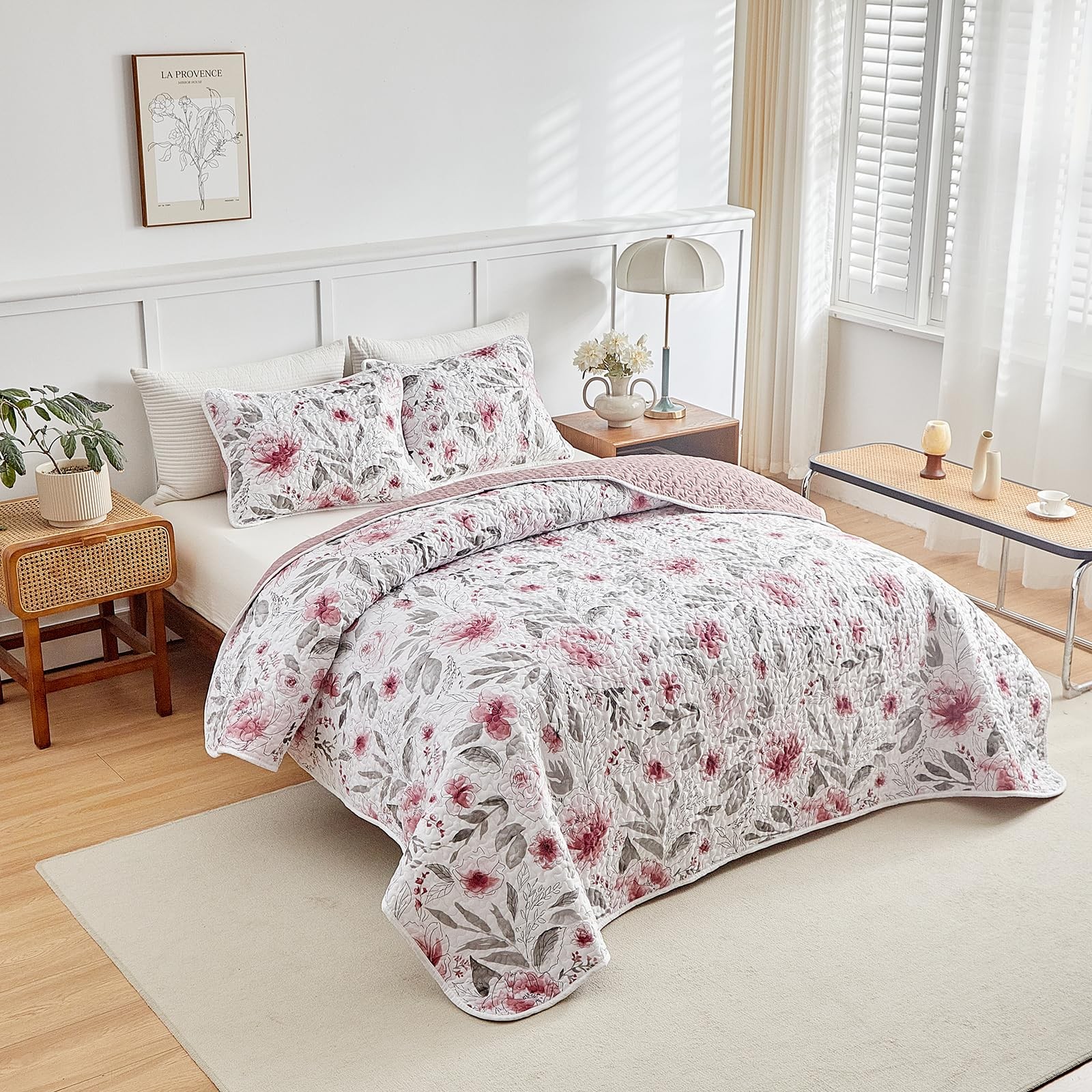 Botanical Quilt Set Full Queen Size 3 Pieces, Blush Pink and Grey Flowers Pri...