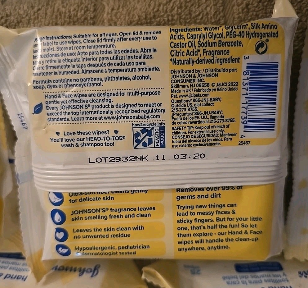 5 Pks Johnson's Baby Hand And Face Sanitizing Wipes For Travel 25 ea K82