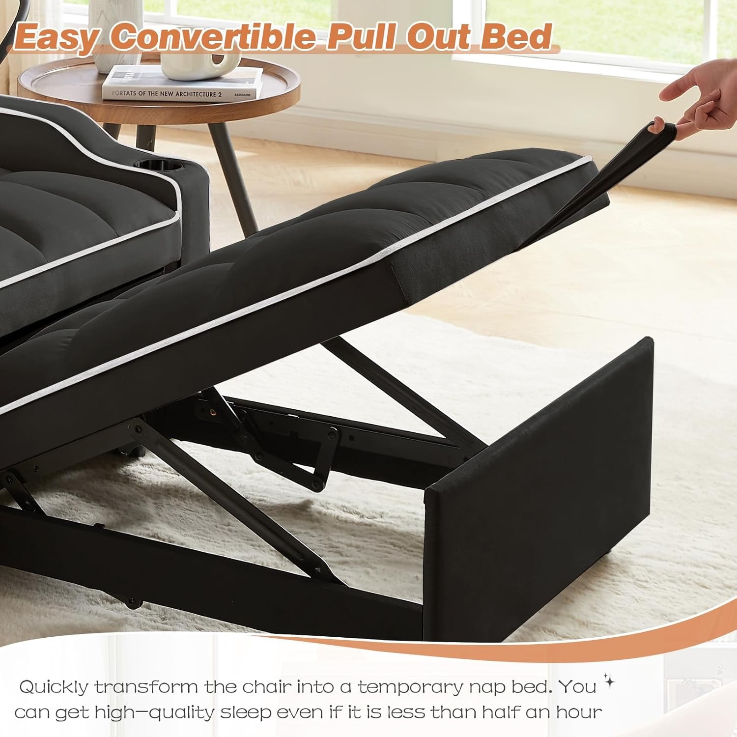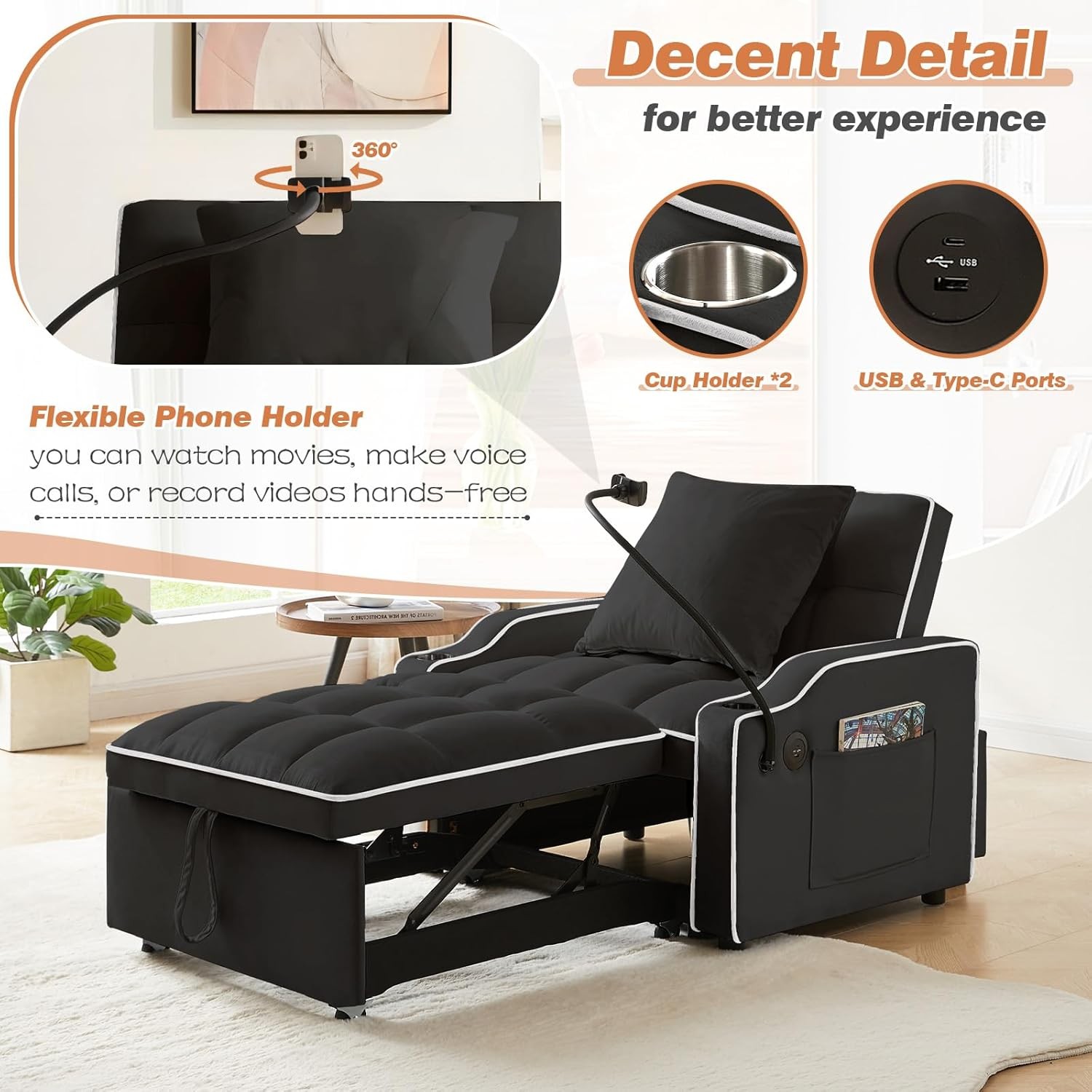 Convertible Sleeper Sofa Chair Bed with USB Ports Phone Holder Cup Holder