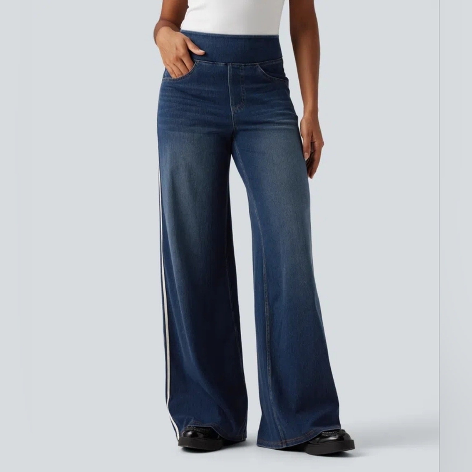 как выглядит NWOT Halara Flex High Waisted Stripe Wide Leg Flowy Washed Casual Jeans Size LR фото