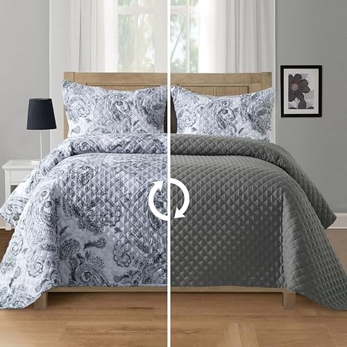 3-Piece Boho Paisley Floral Patchwork Reversible Quilt - Soft King Gray