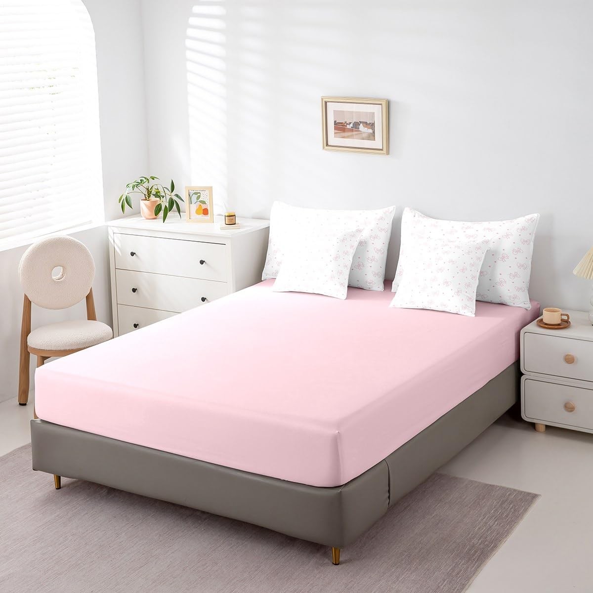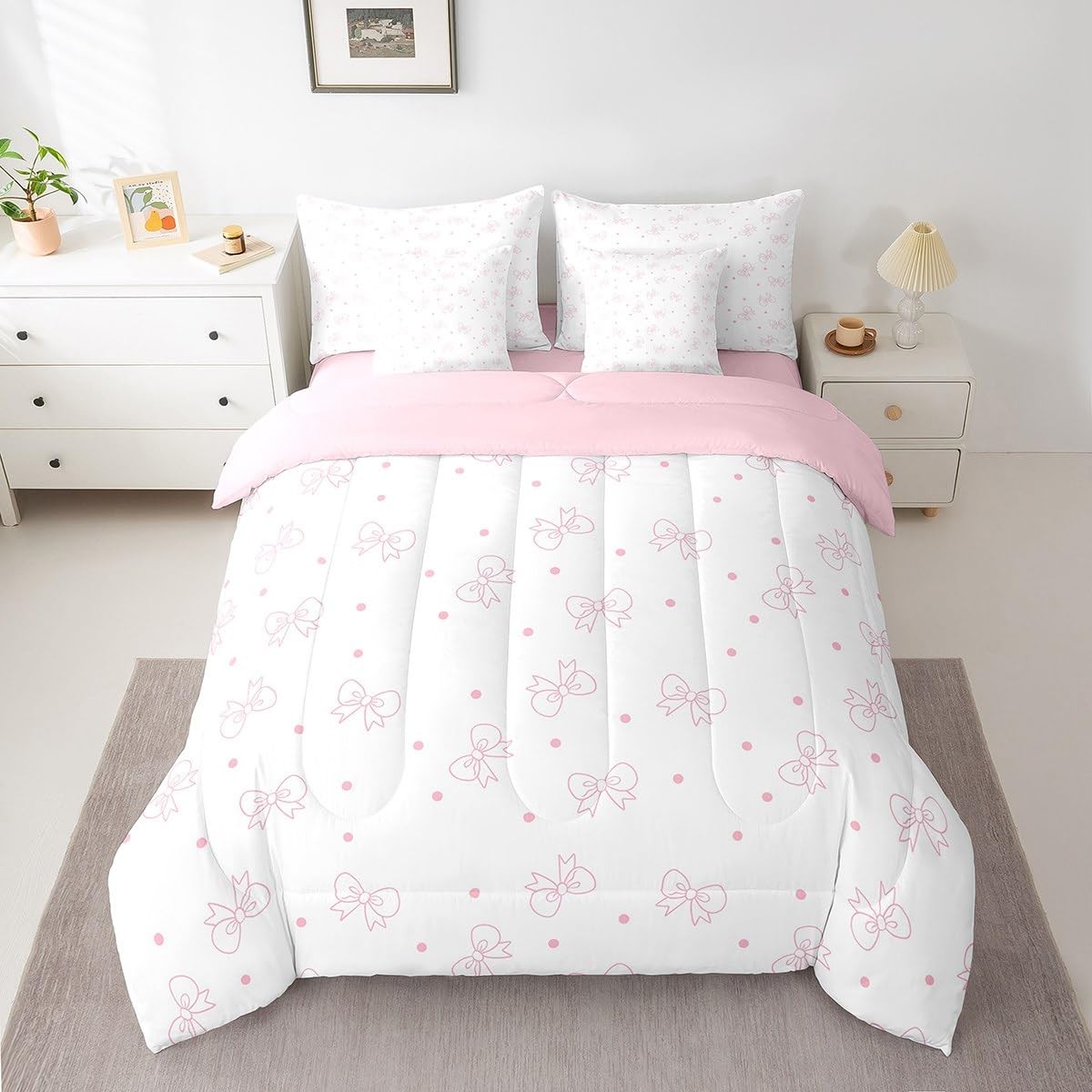 7 Pieces Pink Bows Comforter Set Queen Size, Cute Bowknot Print Bedding Set, ...