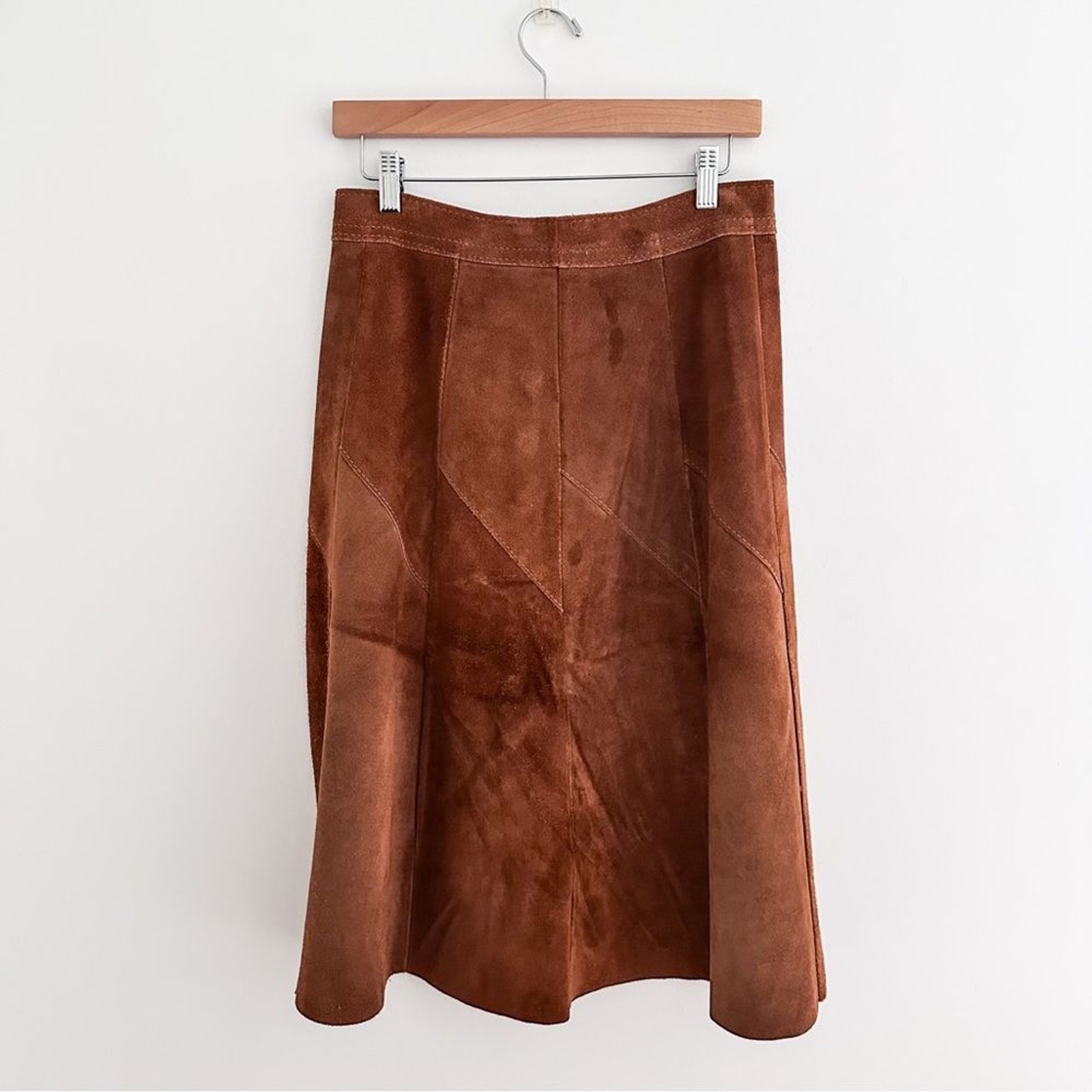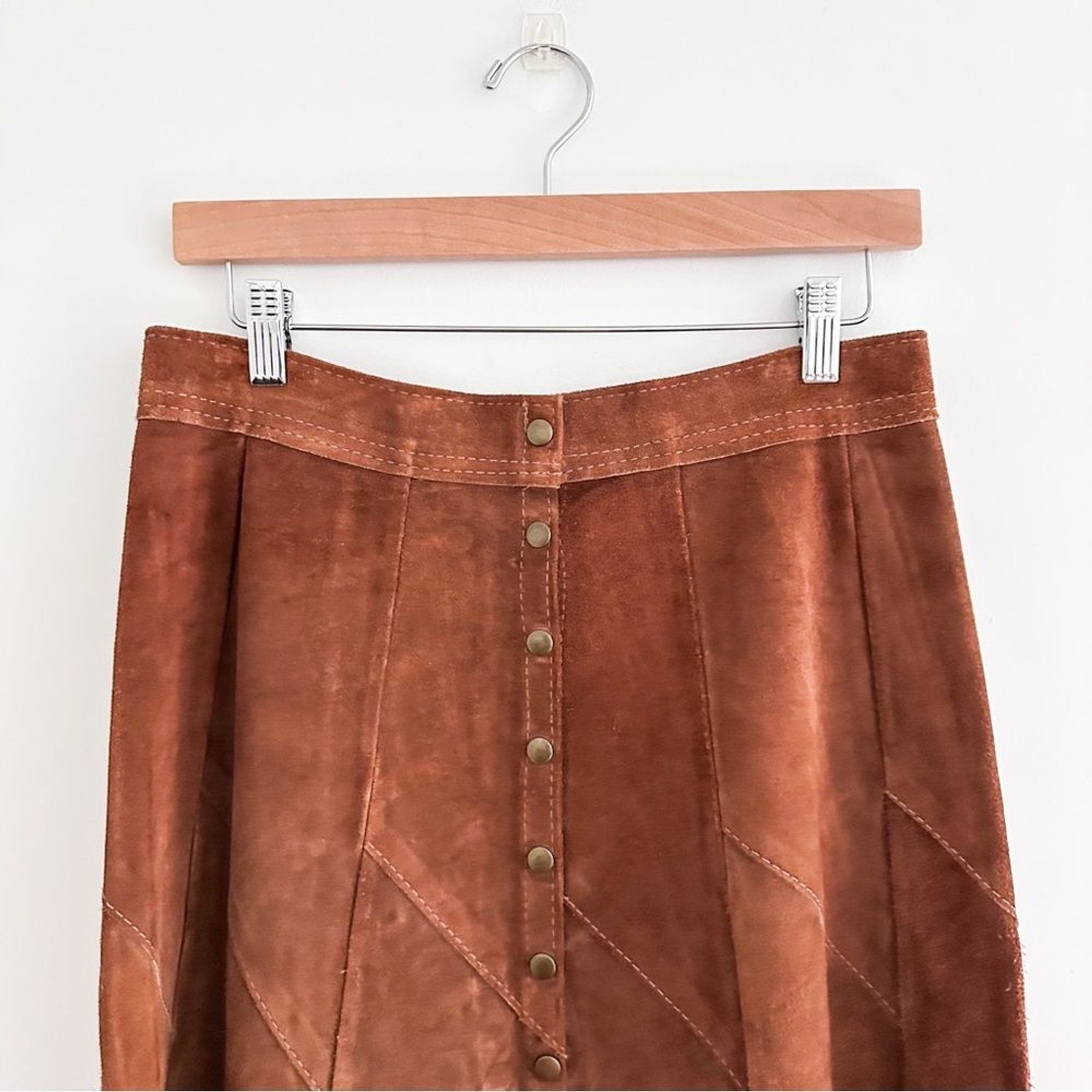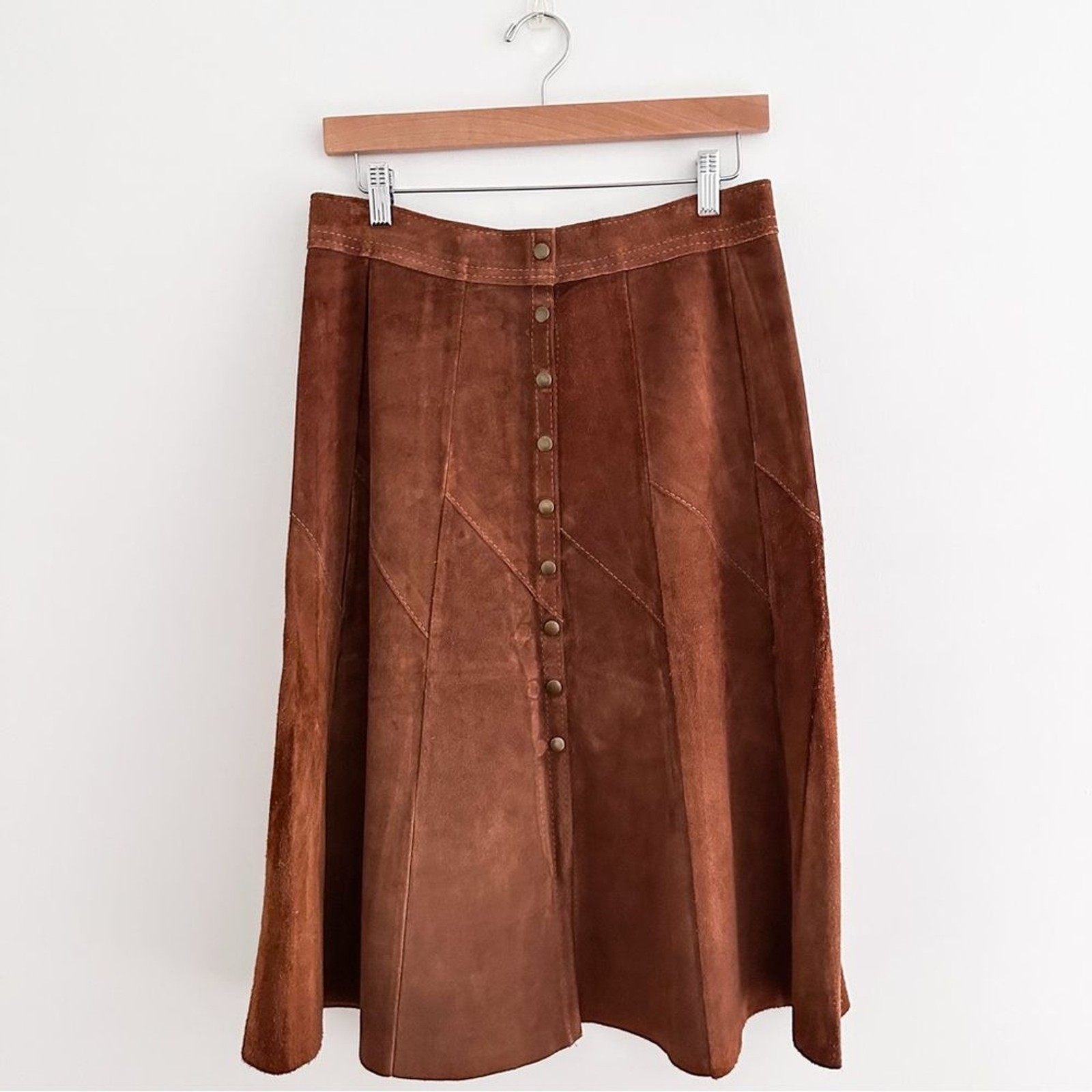 как выглядит Vintage Suede A-Line Midi Skirt Button Front Leather 1970s Tan Skirt 29" Waist фото