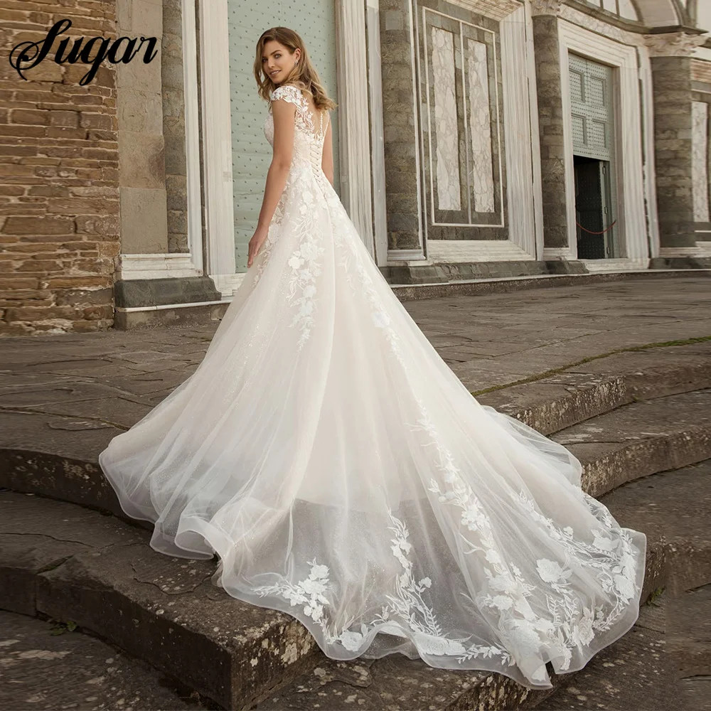 Gorgeous A-Line Wedding Dresses V-Neck Cap Sleeves Lace Appliques Bridal Gowns