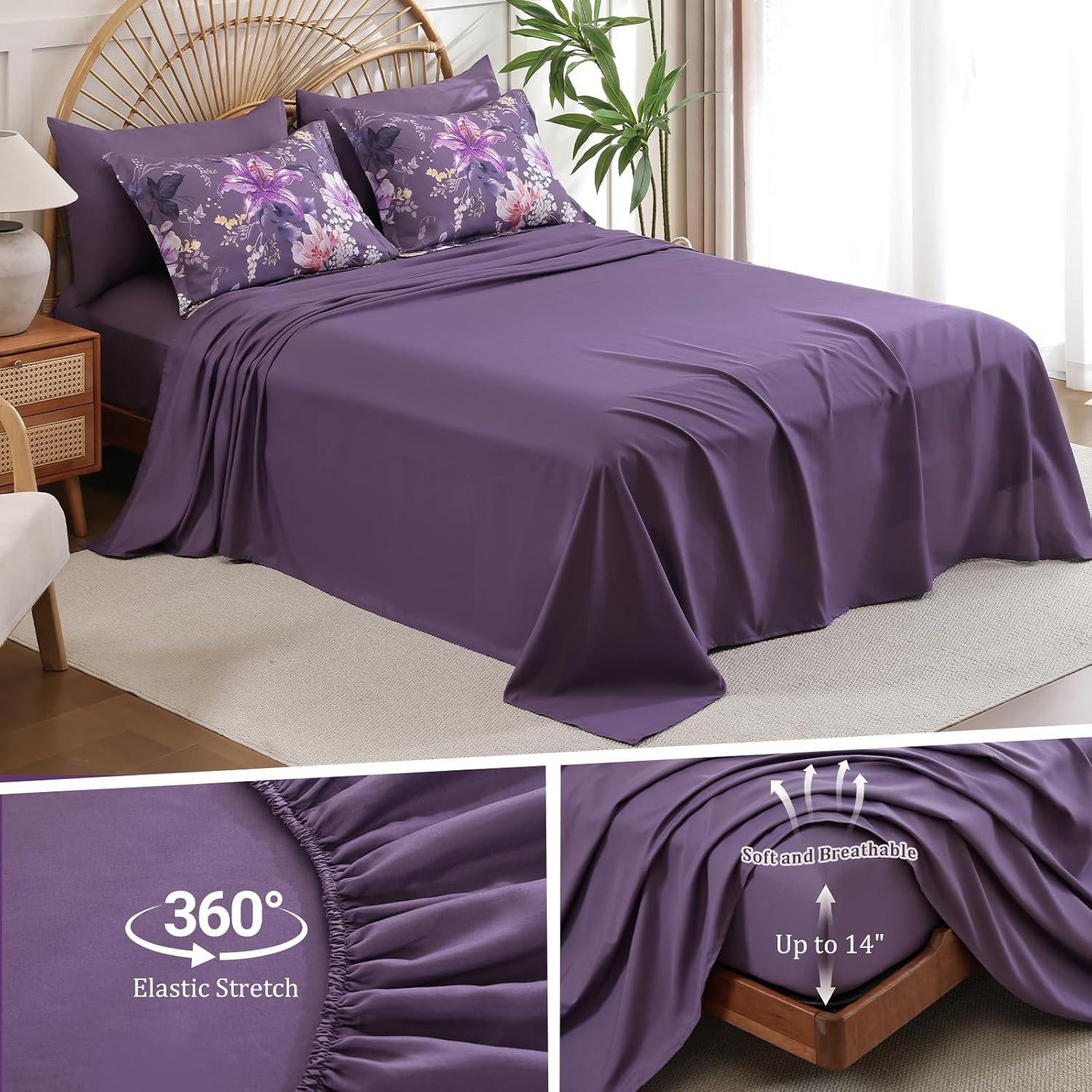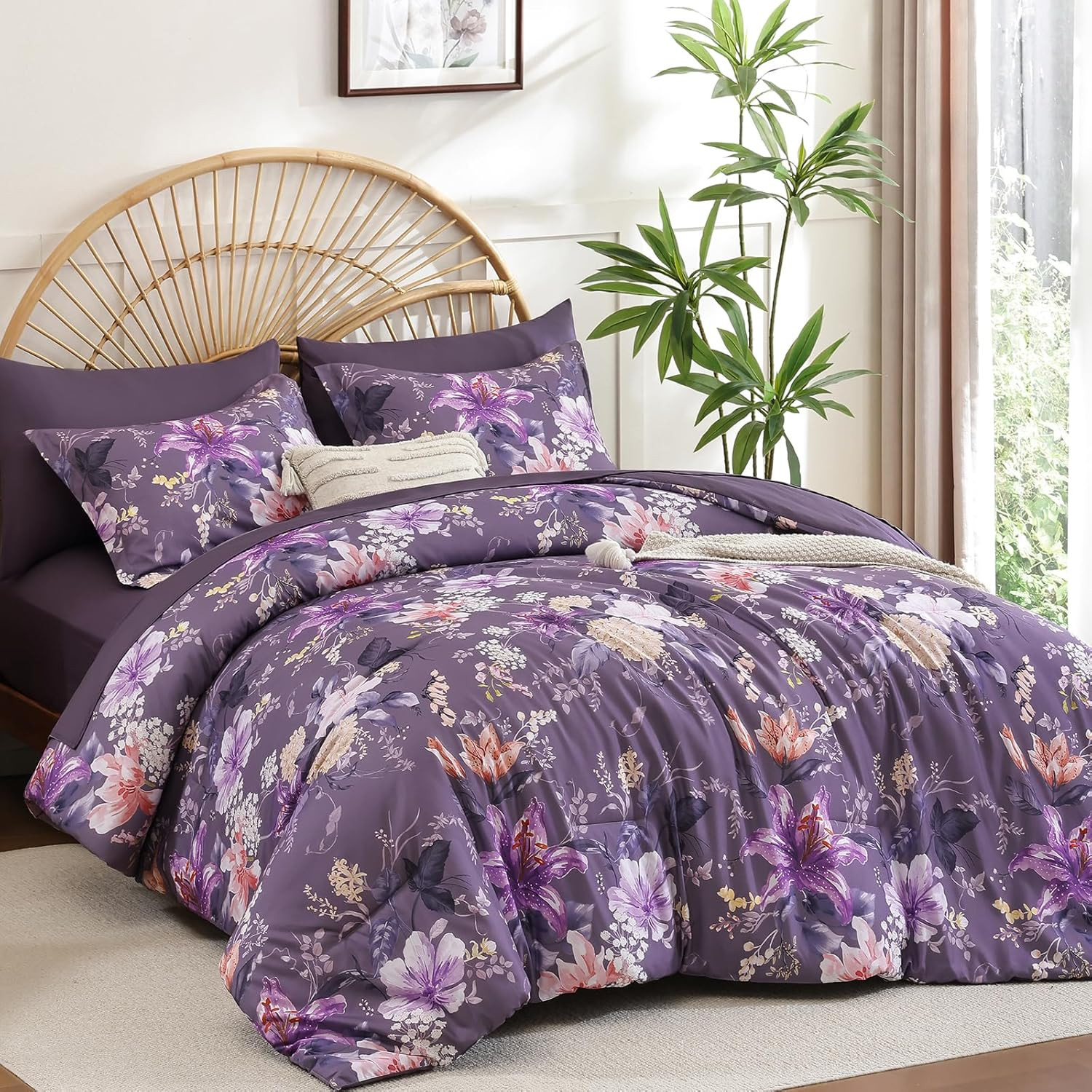 Floral Comforter Set King Size 7 Piece, Purple Flower Bed in a Bag, Elegant Flor