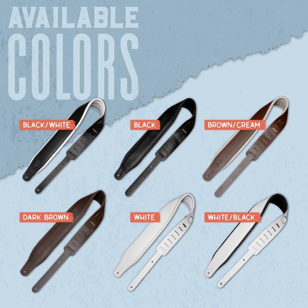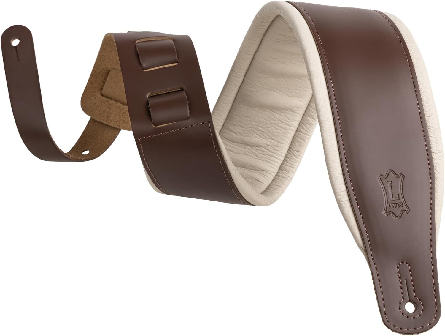 3 Leather Guitar Strap, Brown with Cream Piping for Comfort
