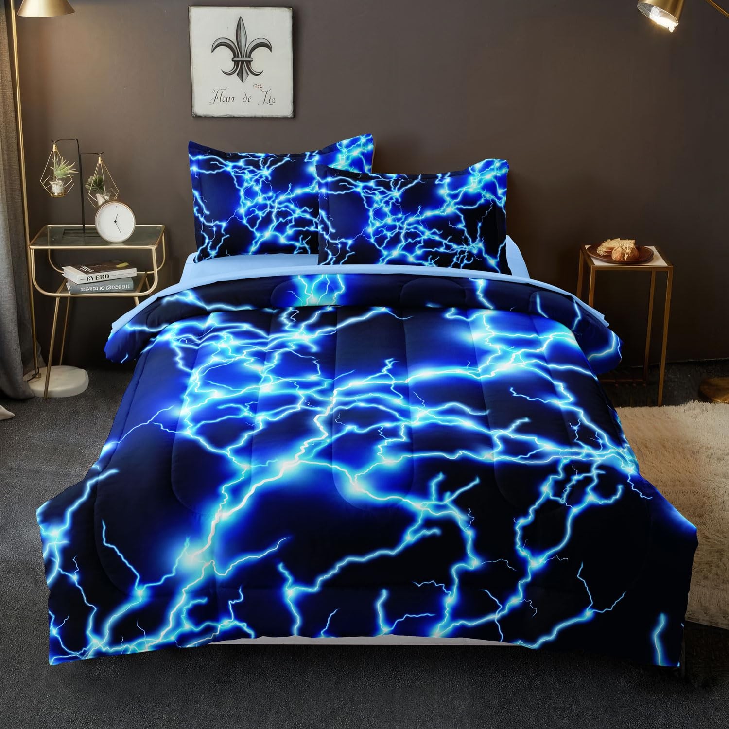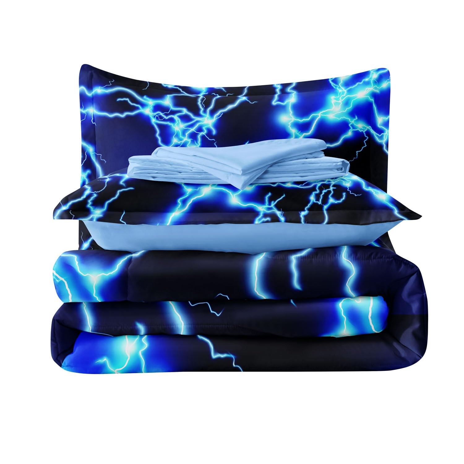 Twin Size Bed in A Bag Lightning Bedding Set for Boys Blue Comforter with Set...