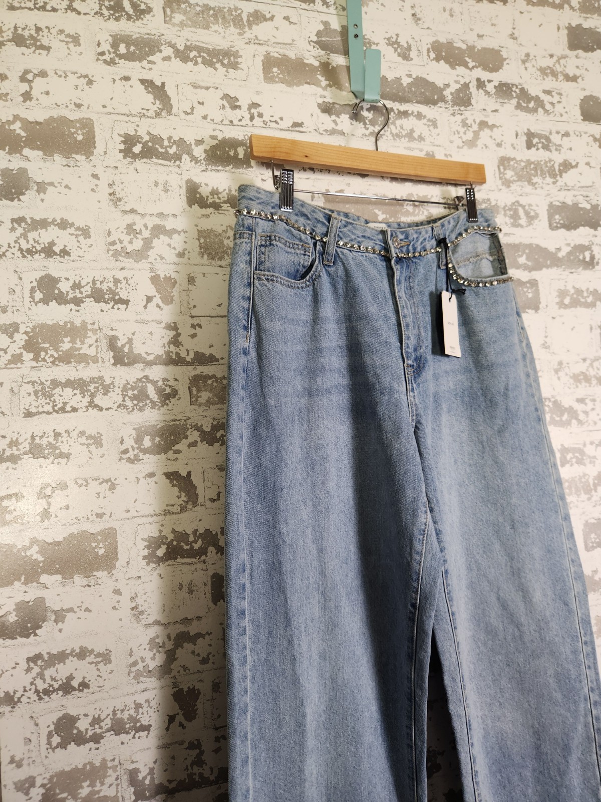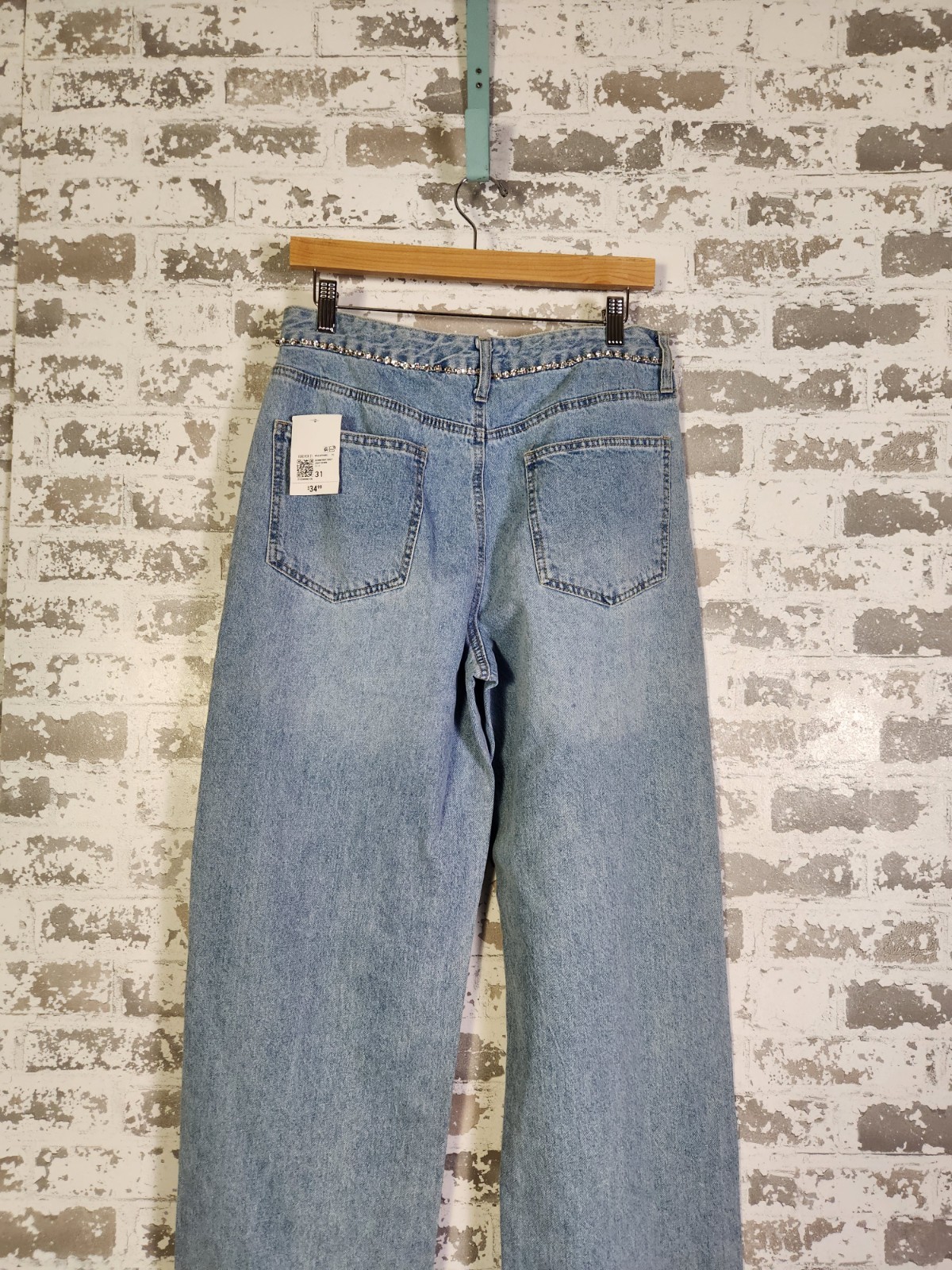 Wide Leg 90s Fit Denim Jeans Size 31 Blue Light Wash Y2K Embellishments