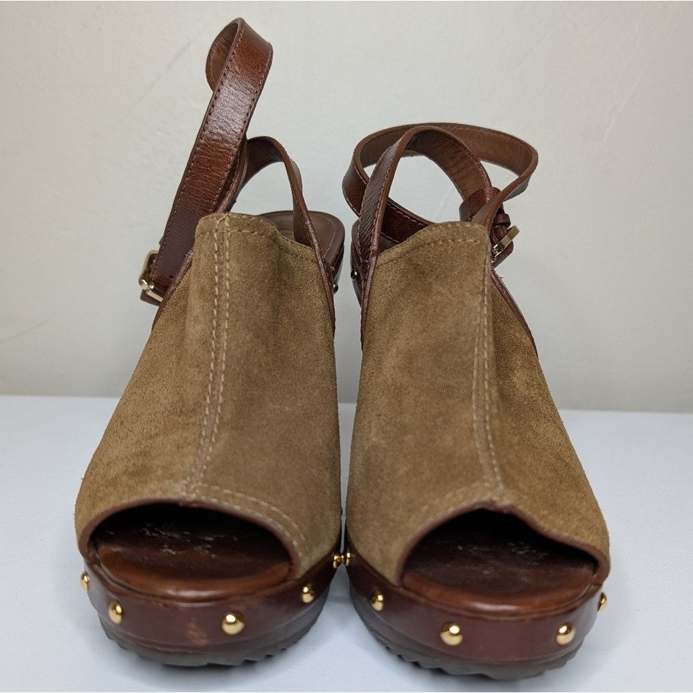 как выглядит Tory Burch Bilson Peep Toe Brown Suede Clogs Size 8 1/2 Medium фото