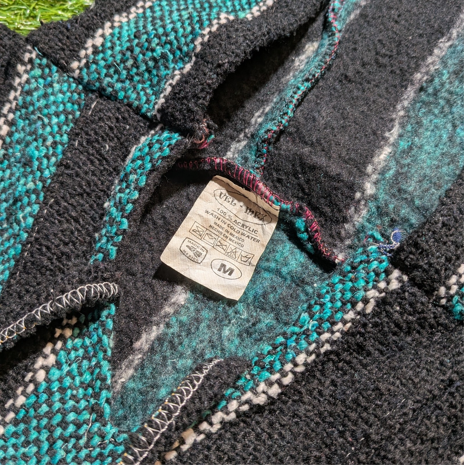 Authentic Vintage Poncho Hoodie Blue Black Handmade Mexico Unisex Size M Boho