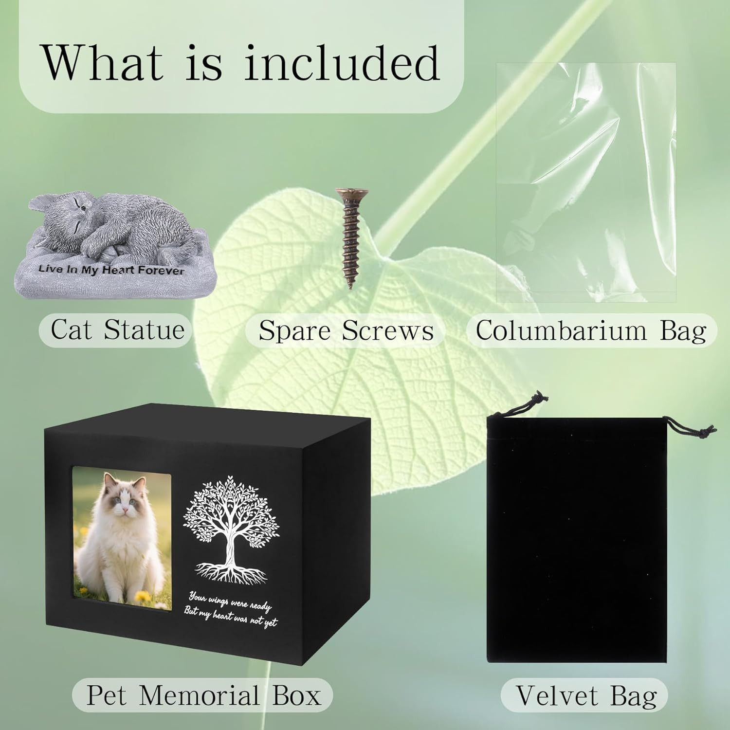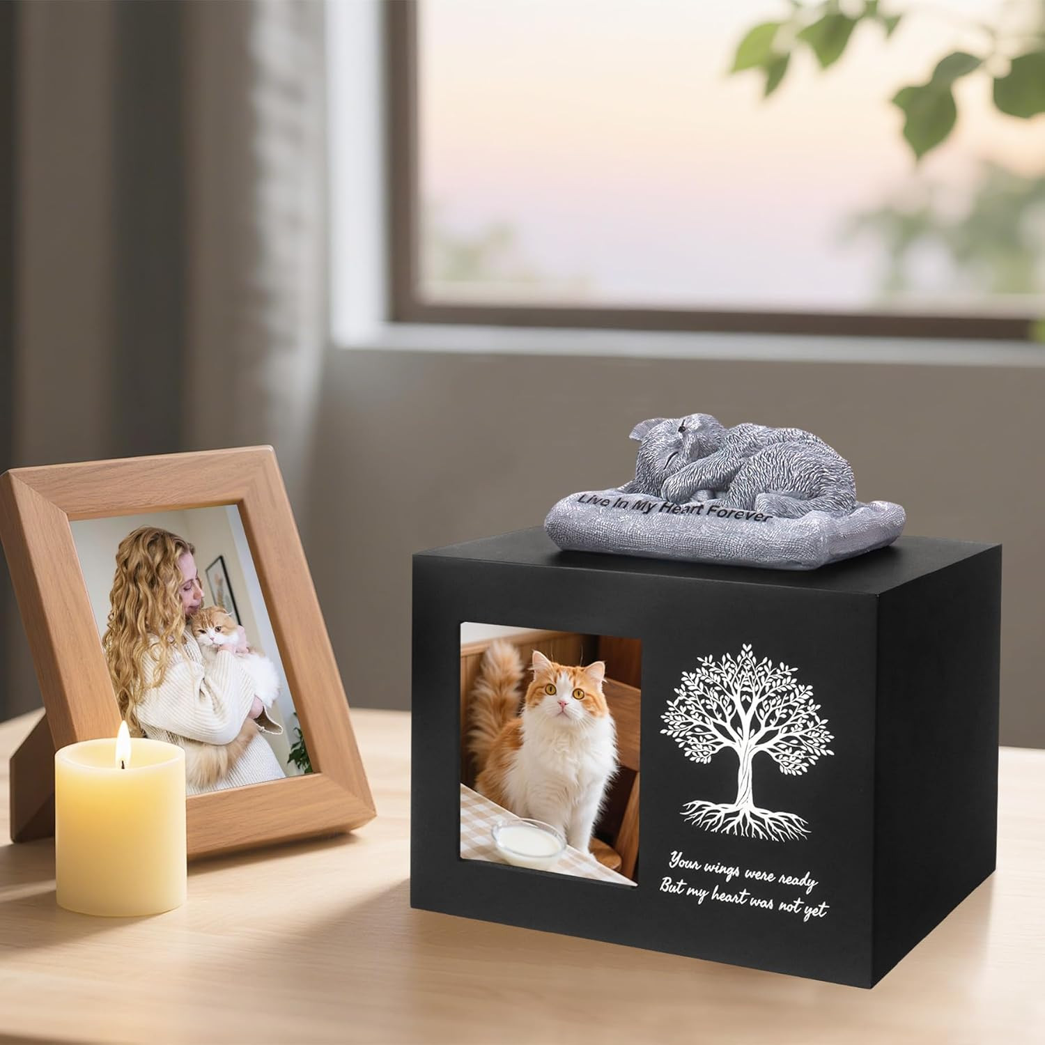 Cat Urn for Ashes, Wooden Tree Pattern Cat Keepsake Box with Photo Frame, Resin
