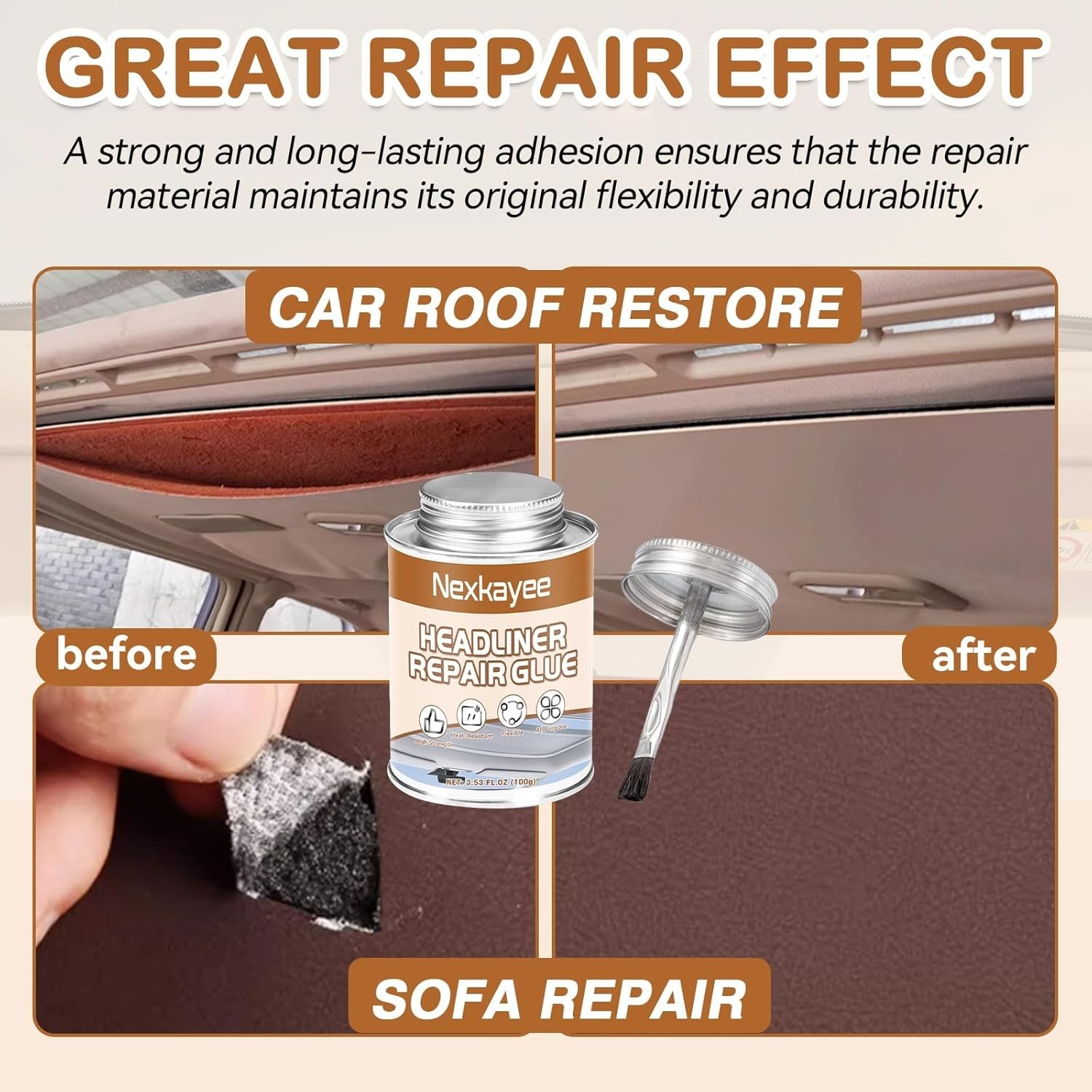 Headliner Repair Glue 100ml, Flexible Upholstery Glue for Cars, with Brush, S...