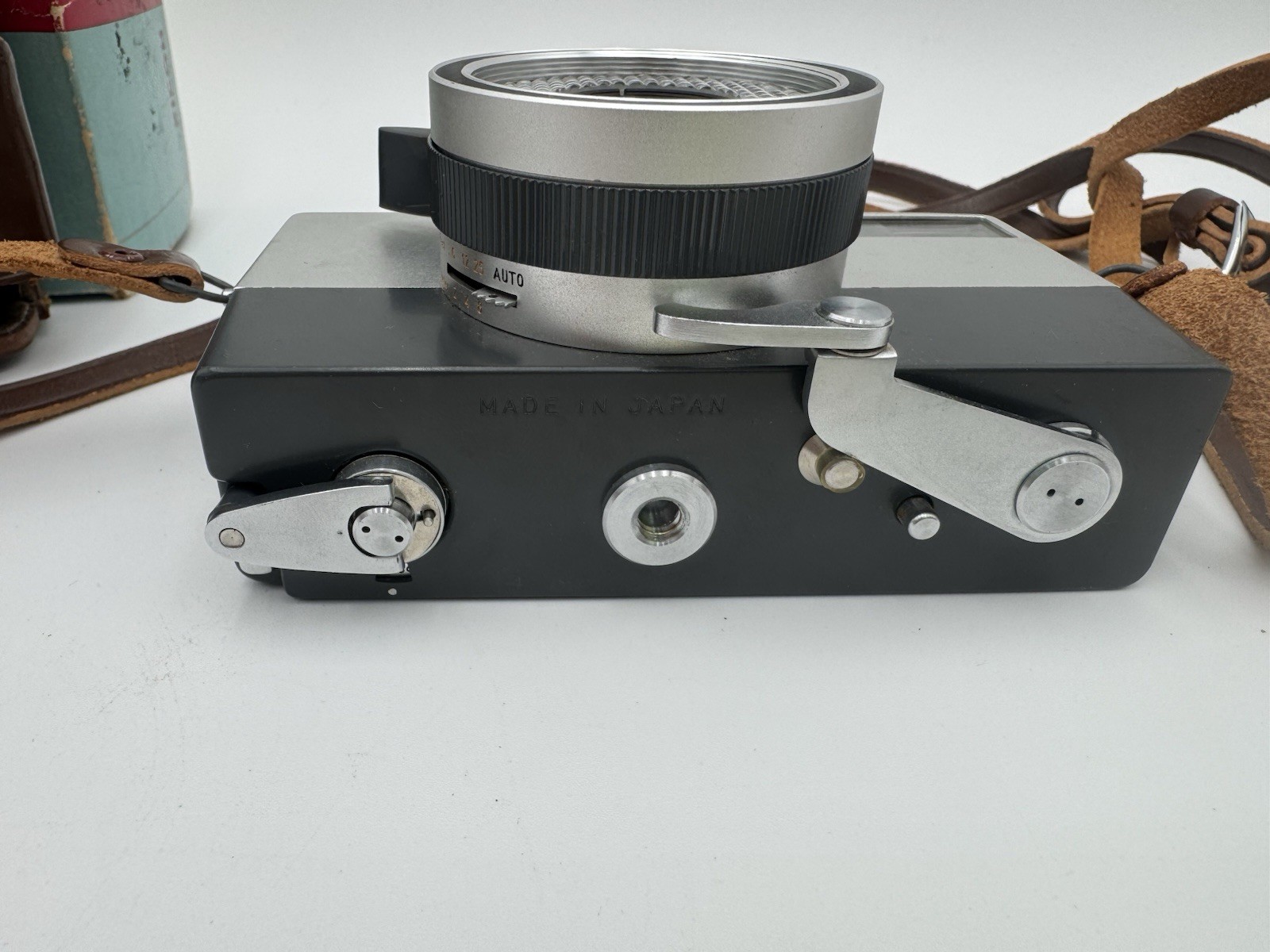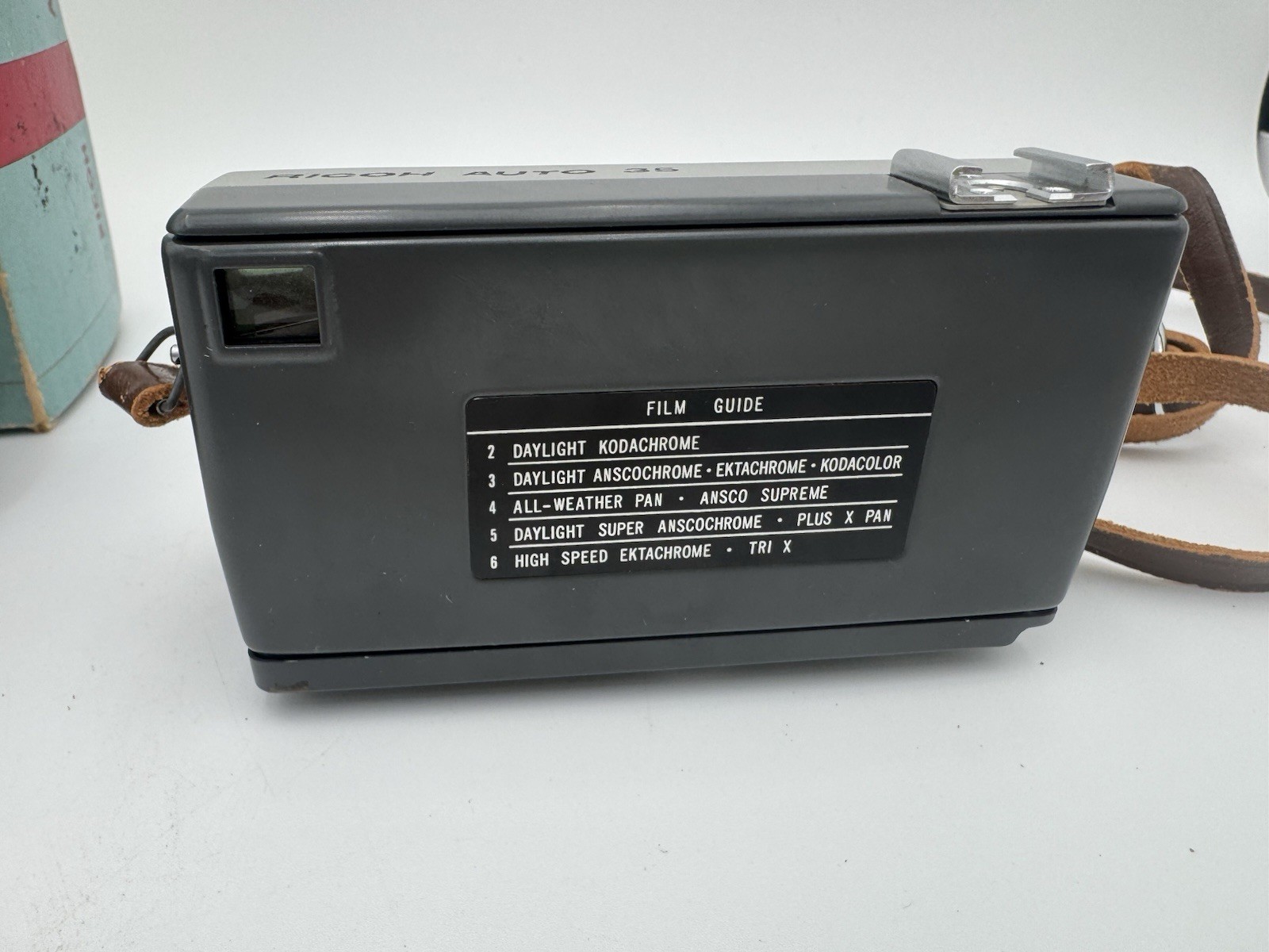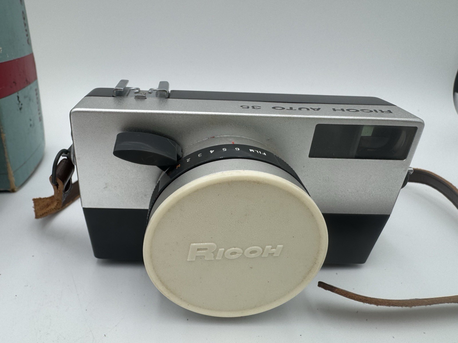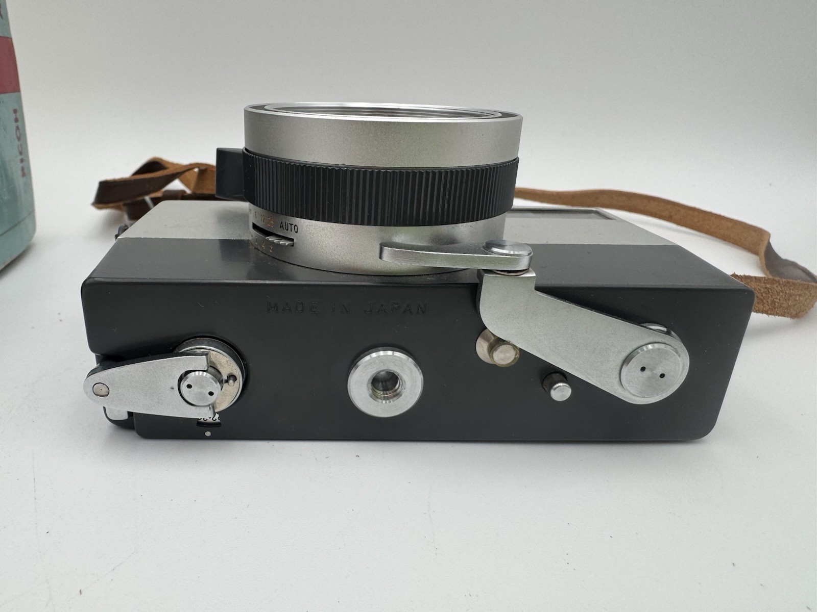 Ricoh Auto 35 camera, leather case, Japan, Riken Ricoh F 4cm Lens Original Box