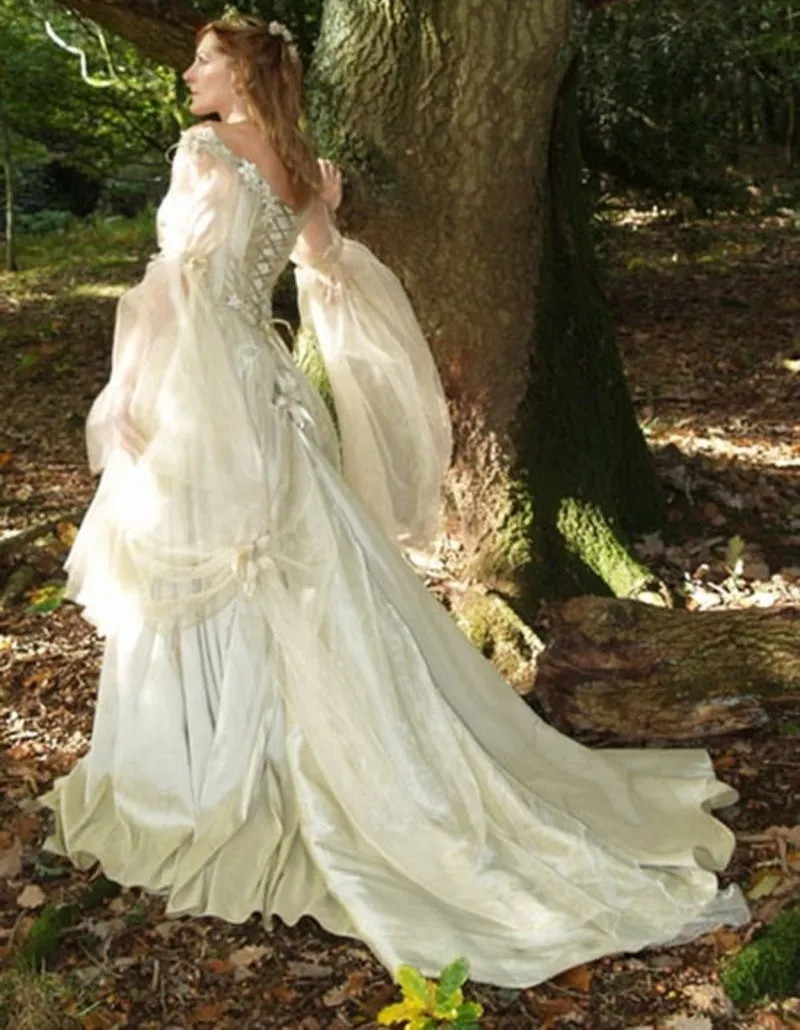 как выглядит Vintage Victorian Wedding Dresses Long Sleeves Champagne Gold Corset Bridal Gown фото