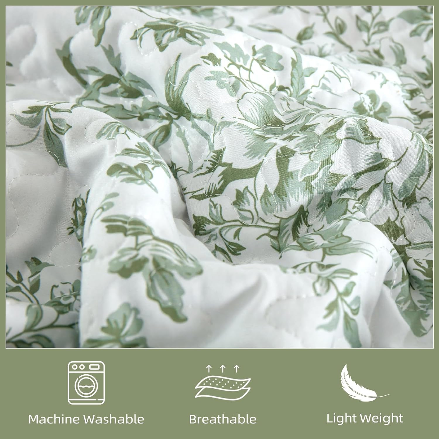 Quilts Queen Size, Sage Green Quilt Bedding Set with 2 Pillowcases, Botanical Qu