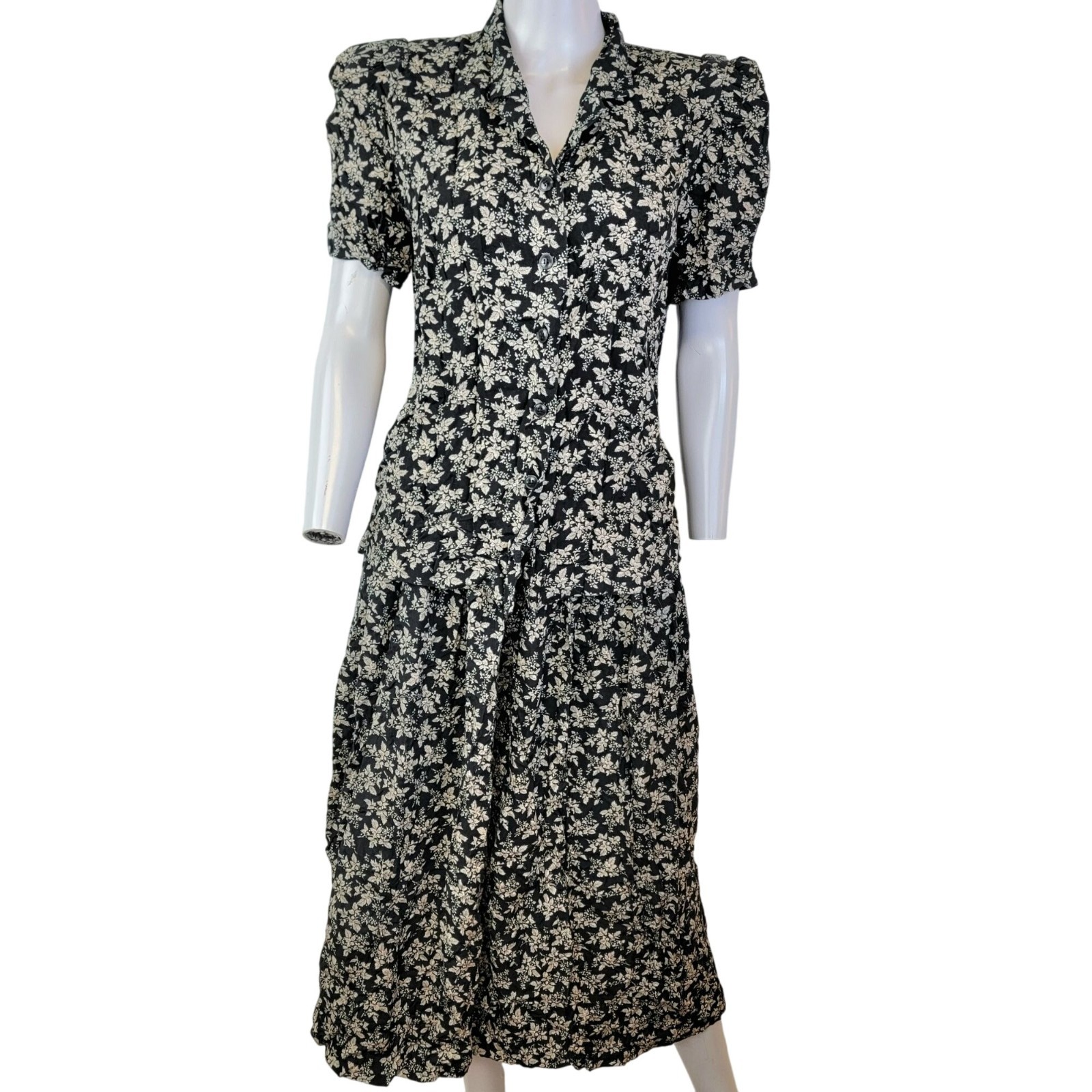 Vintage 80s Floral Set Women Medium Black Button Blouse Top Midi Skirt Formal 10