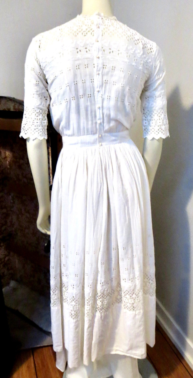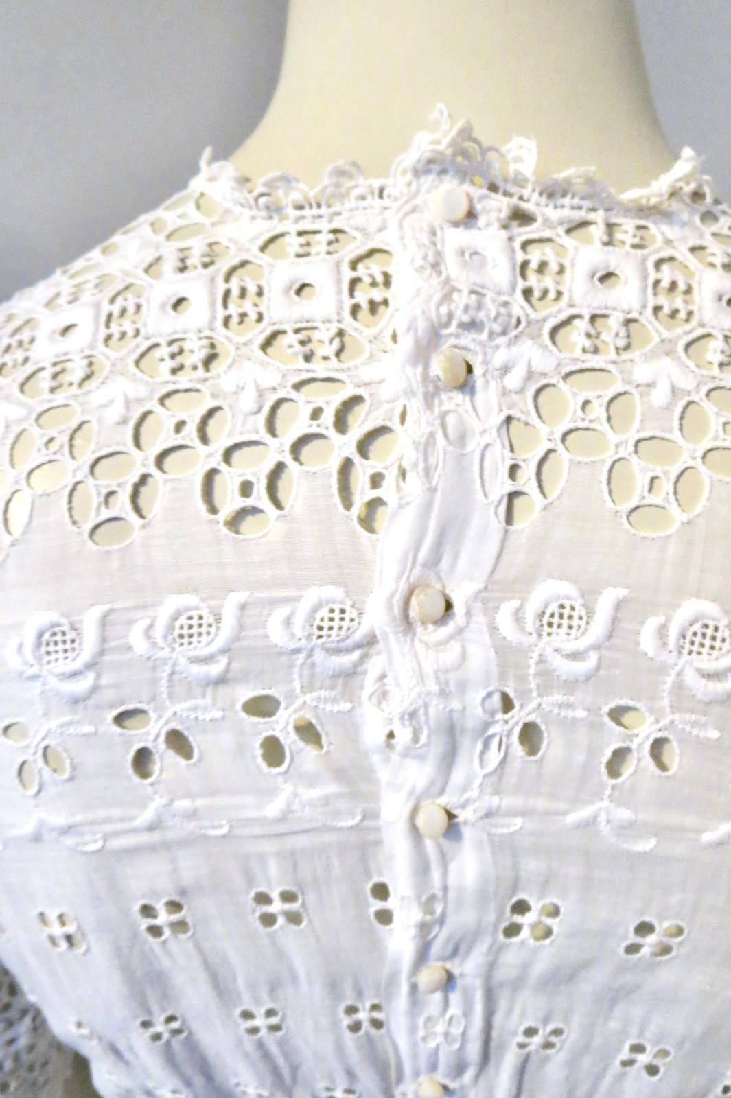 Edwardian Dress 1910s White Eyelet Embroidered Lace Tiny MOP Buttons 32 Bust