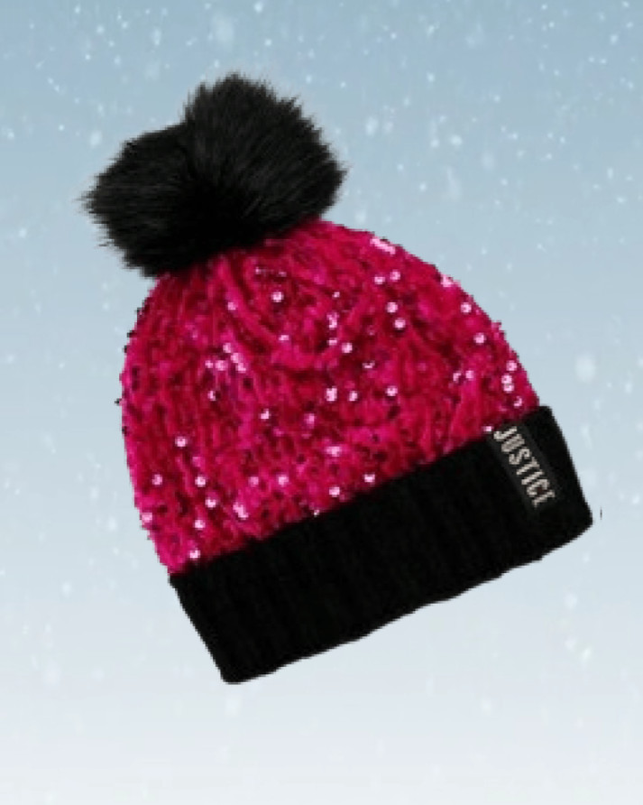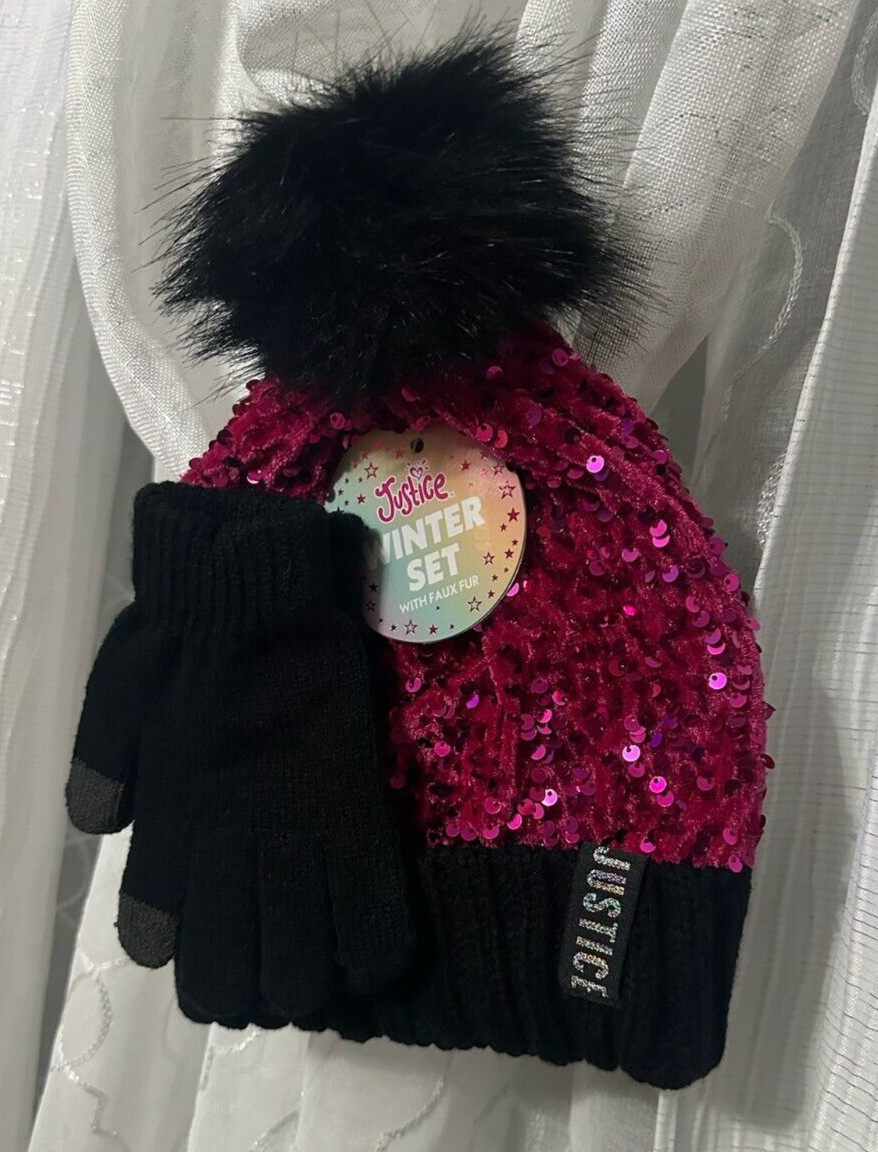 Justice Girls Sequin Beanie Hat with Pom and Gloves, 2-Piece Set NEW