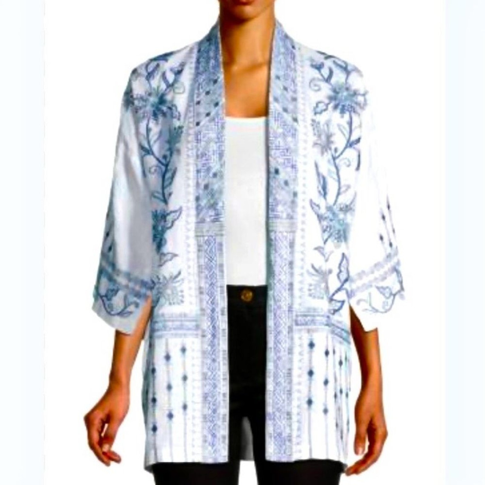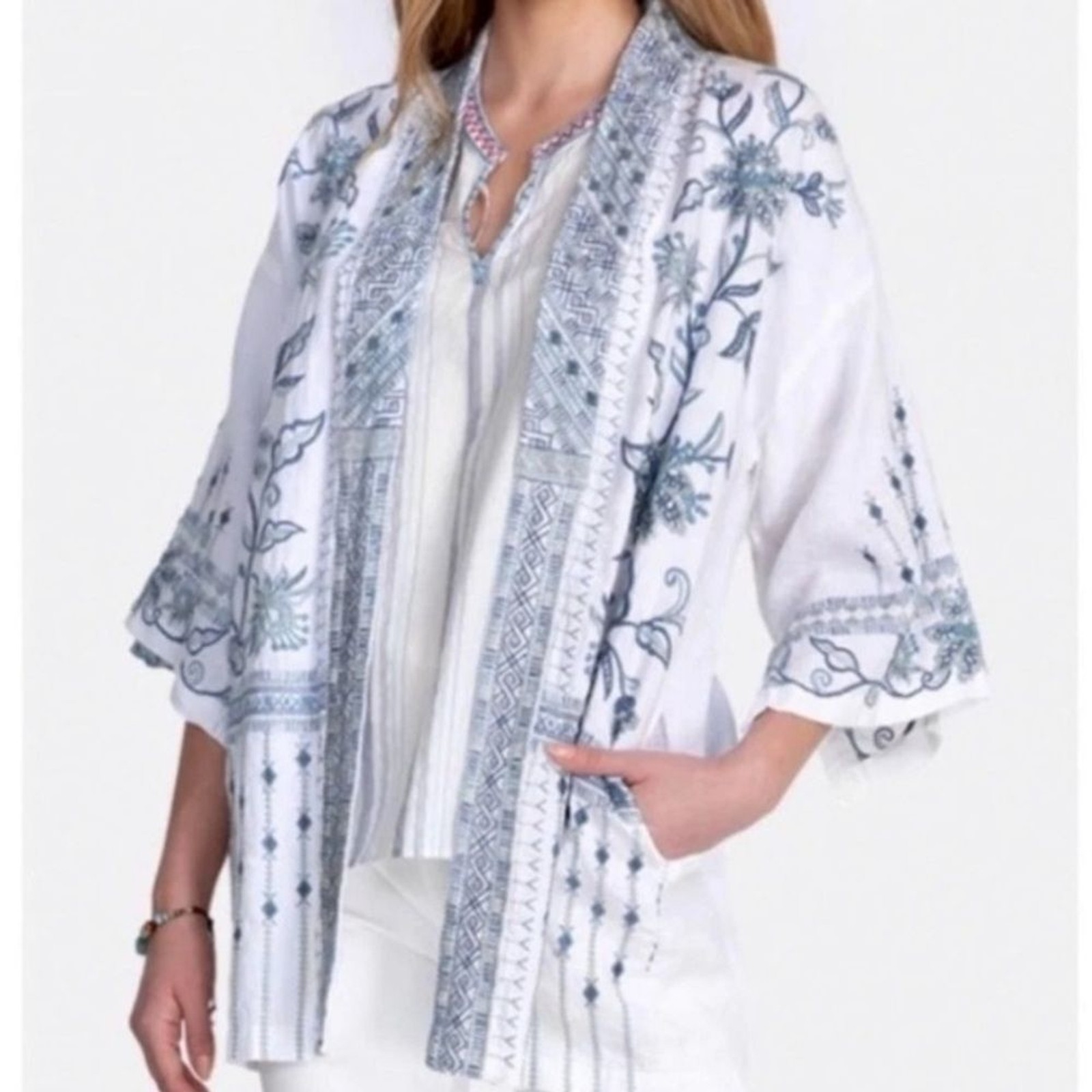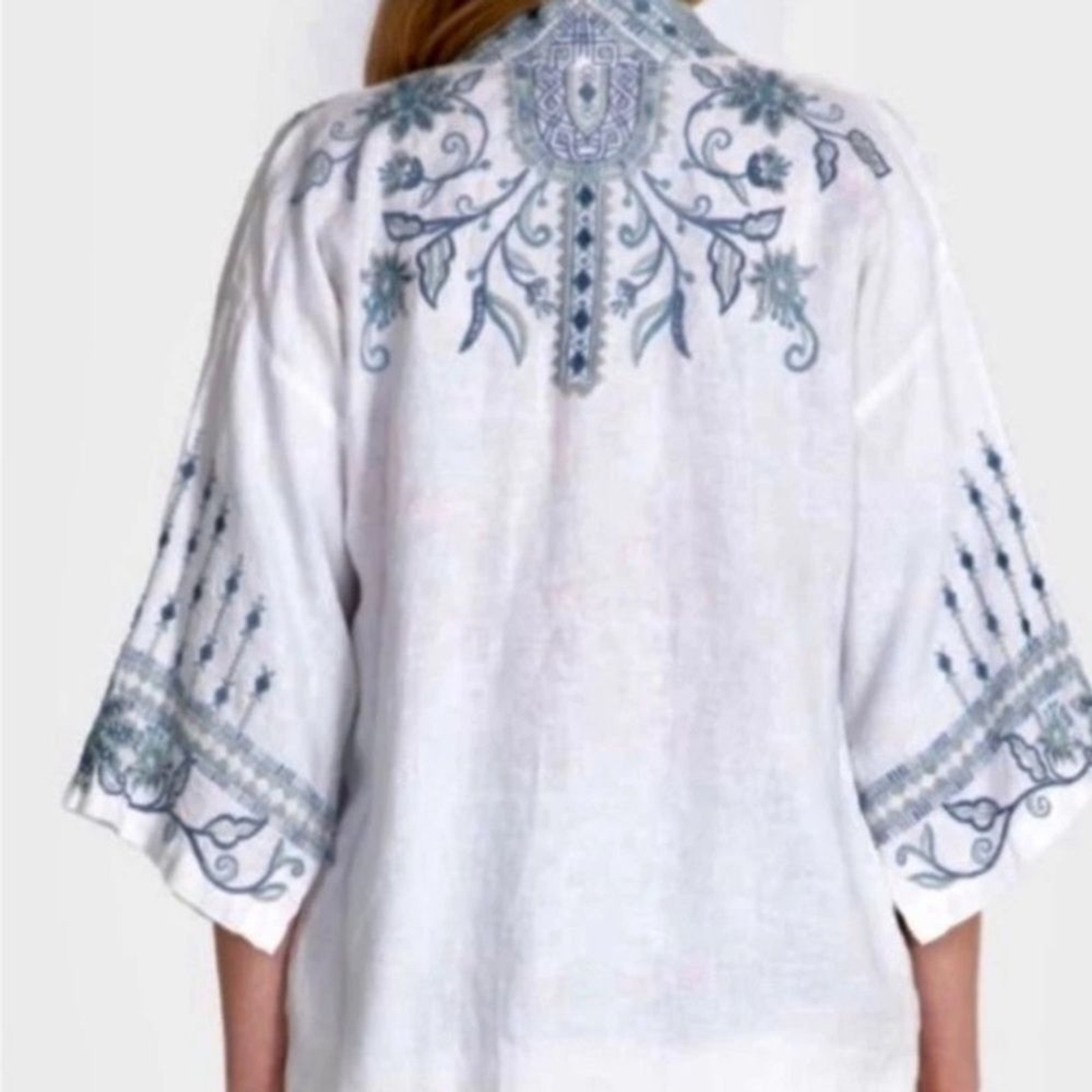 как выглядит NEW Johnny Was Maike Linen Kimono Heavily Embroidered Floral Blue White Linen M фото