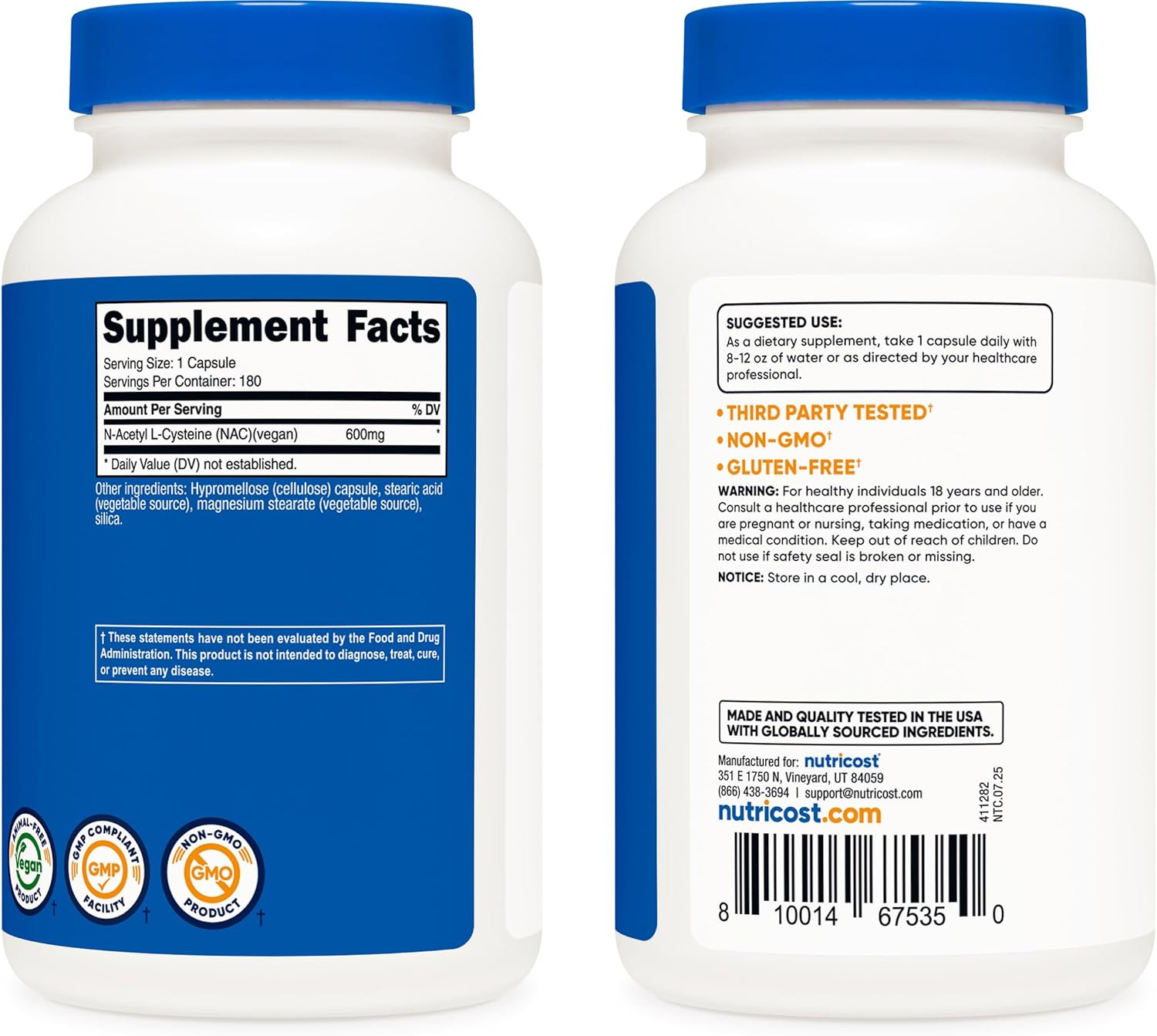 N-Acetyl L-Cysteine NAC 600Mg, 180 Capsules - Non-Gmo, Gluten Free
