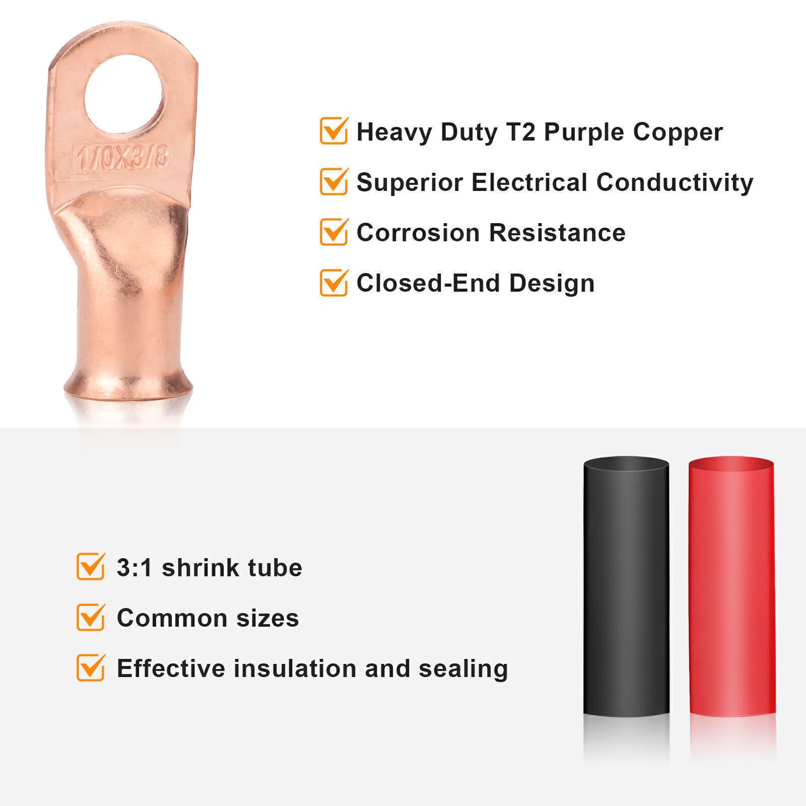 40 pcs 1/0 AWG Gauge Copper Lugs w/RED BLACK Heat Shrink Ring Terminals Set