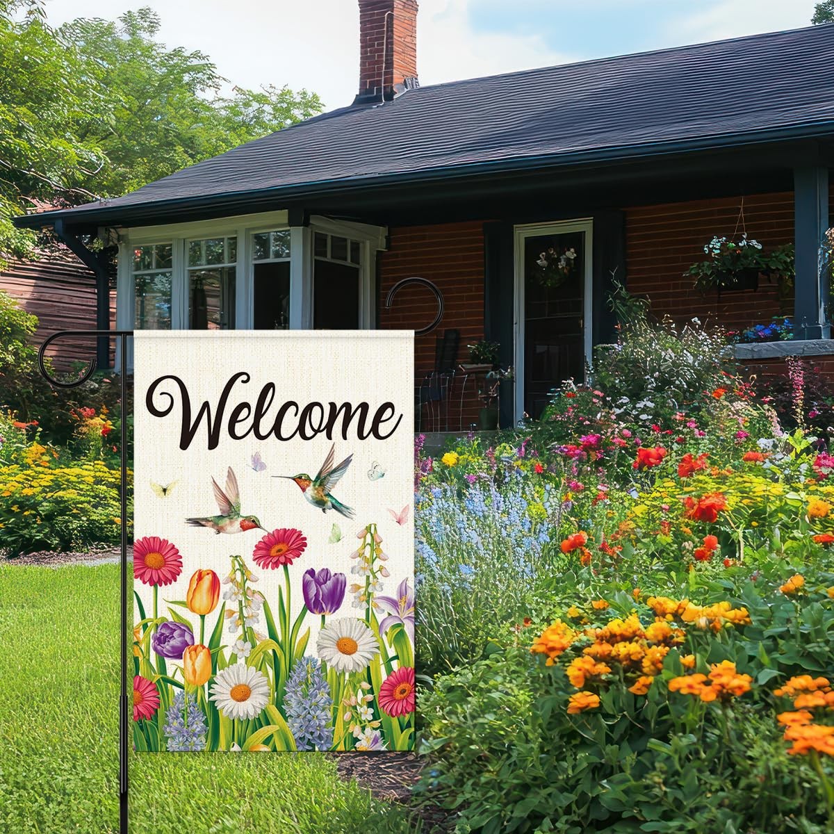Welcome Spring Garden Flag 12x18 Inch Double Sided, Floral Hummingbird Outdoo...