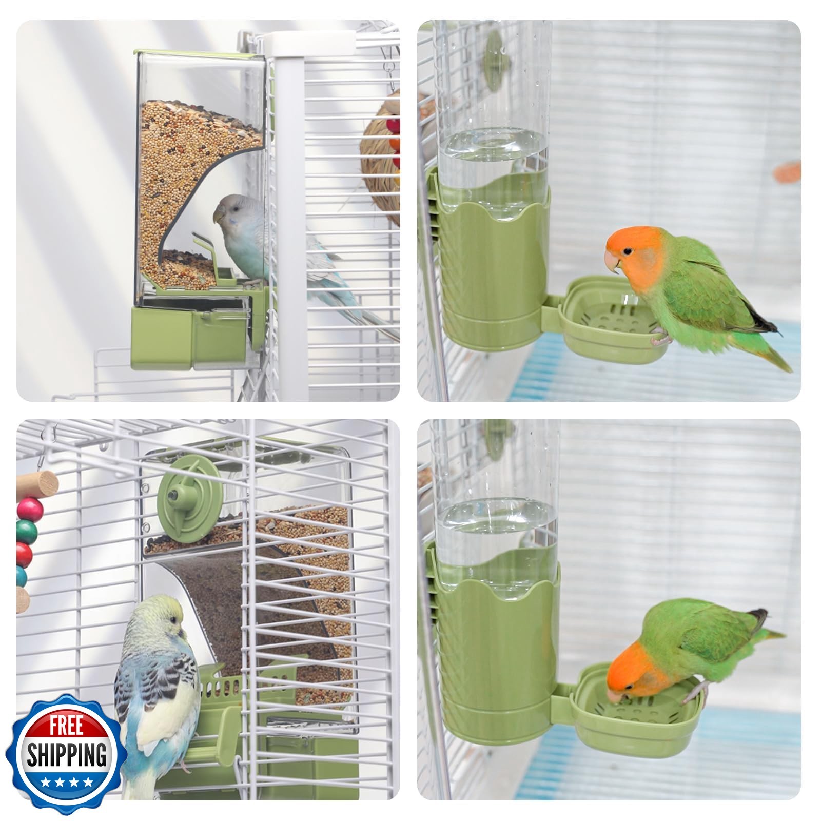 Bird Feeder Water Dispenser Set, Automatic Cage Feeder with Perch for Seed Pa...