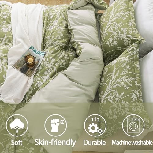 Floral Duvet Cover Set Size,3pcs Reversible Pattern-Solid Queen Sage Green