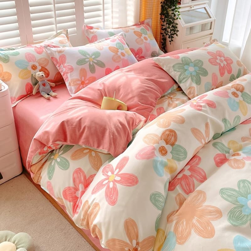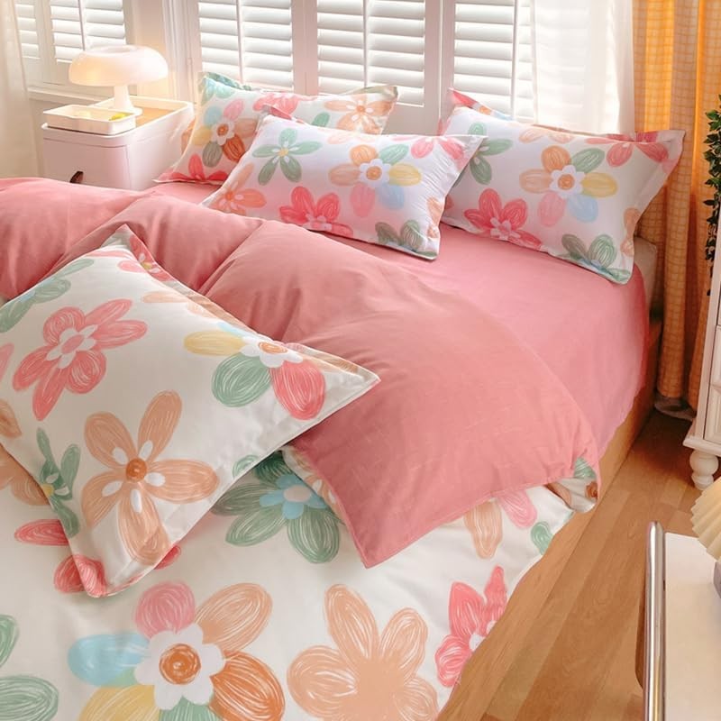 Pink Bedding Duvet Cover Sets Flowers Printed Pattern Twin Pink Green