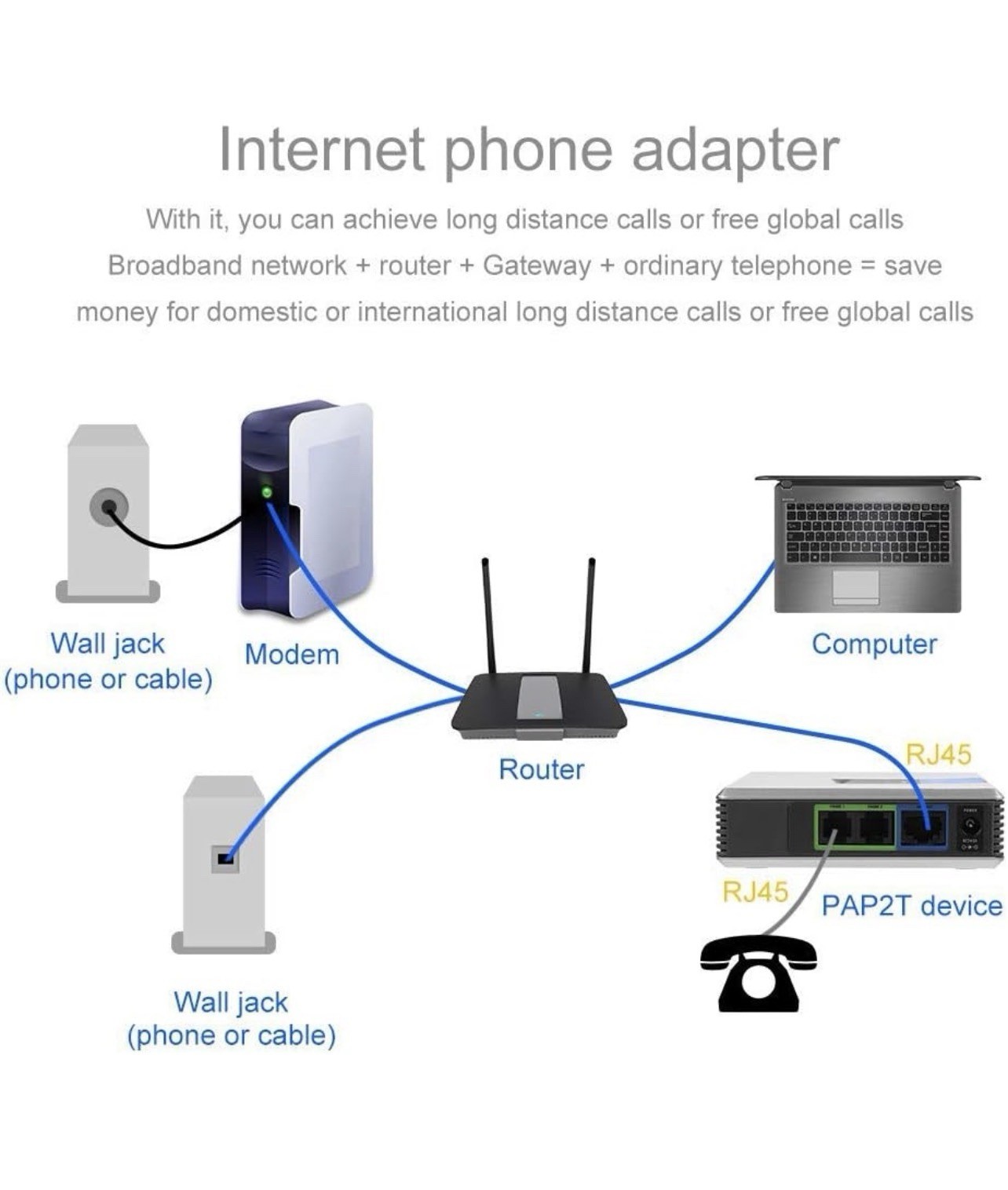 VOIP Gateway 2 Ports SIP V2 Protocol Internet Phone Adapter with Network Cabl...