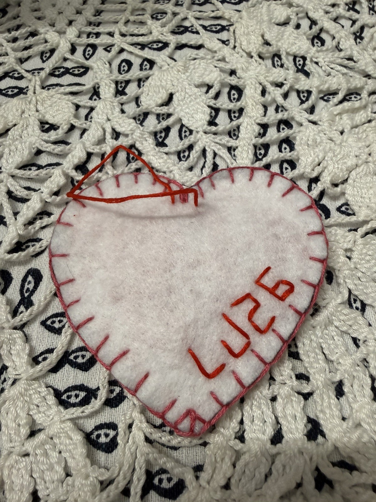 Handmade Embroidered Valentines Day Felt Heart White Red and Pink Ornament
