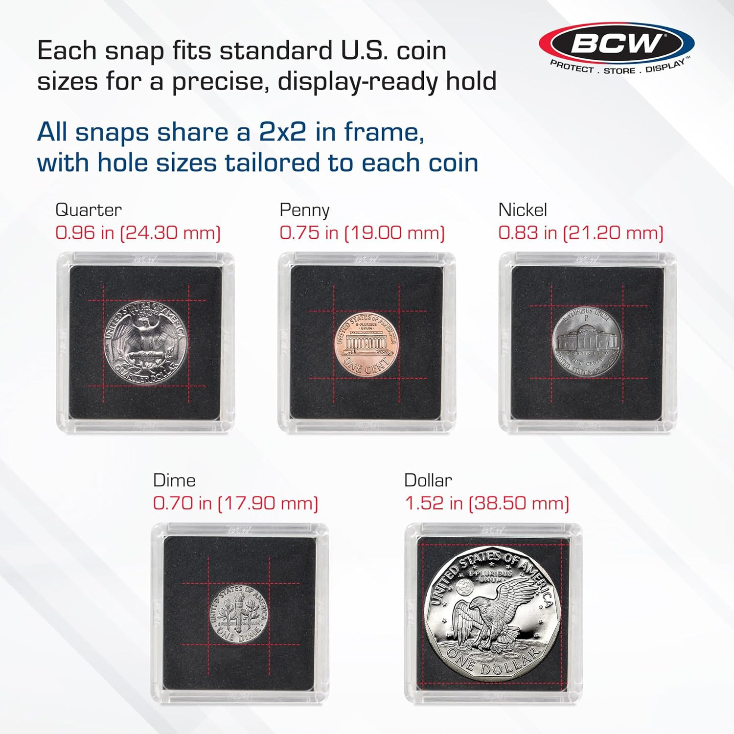 • 2X2 Coin Snap Holders Assortment Pack of 25 5 Assorted Sizes Dual-Sided Blac