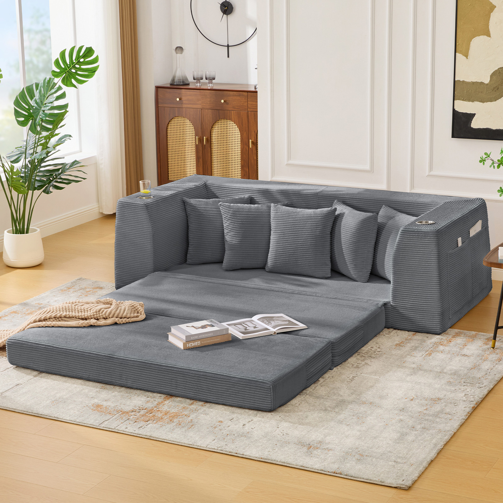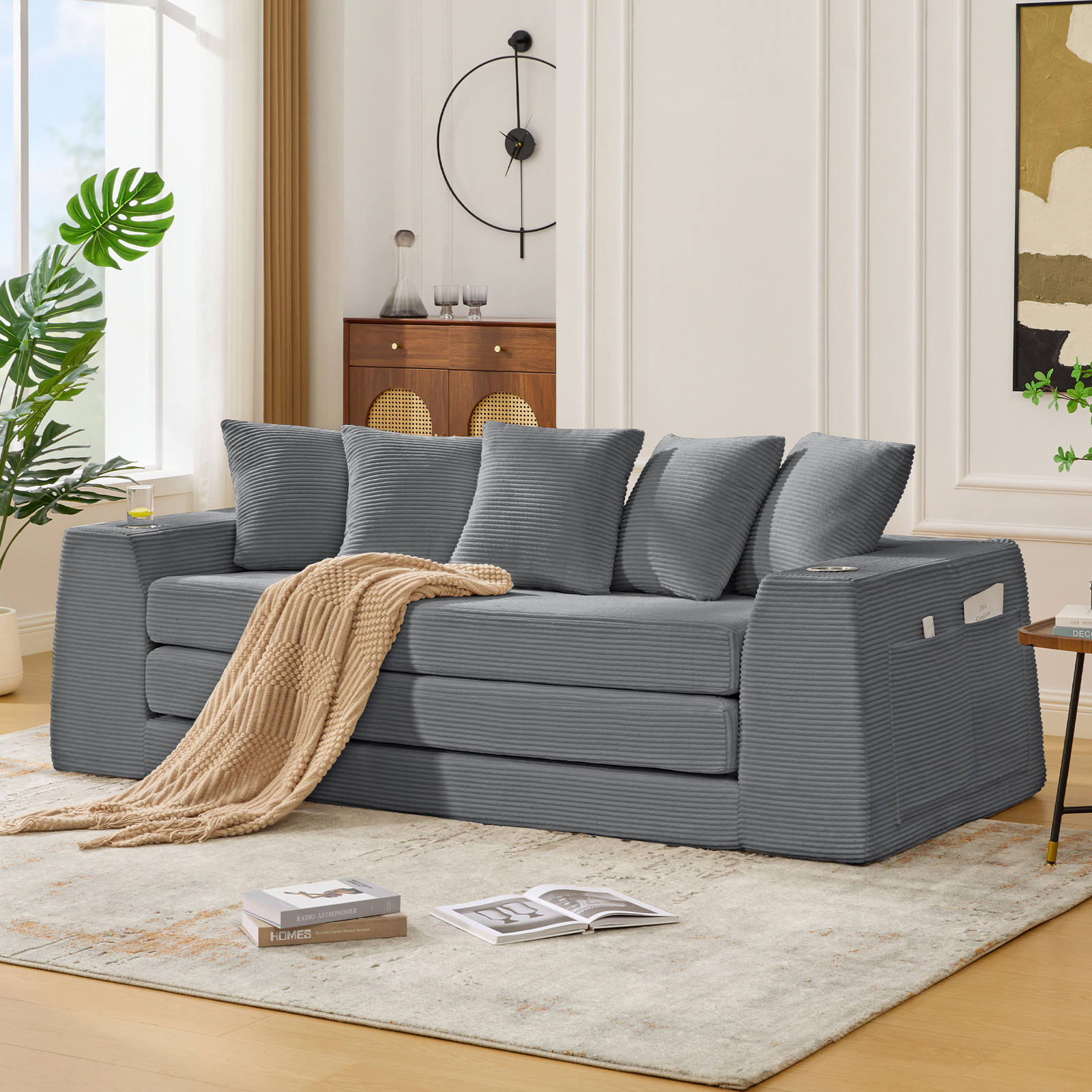 2 in 1 Convertible Sofa Bed,Loveseat Corduroy Pull Out Sofa Bed w/5 Pillows