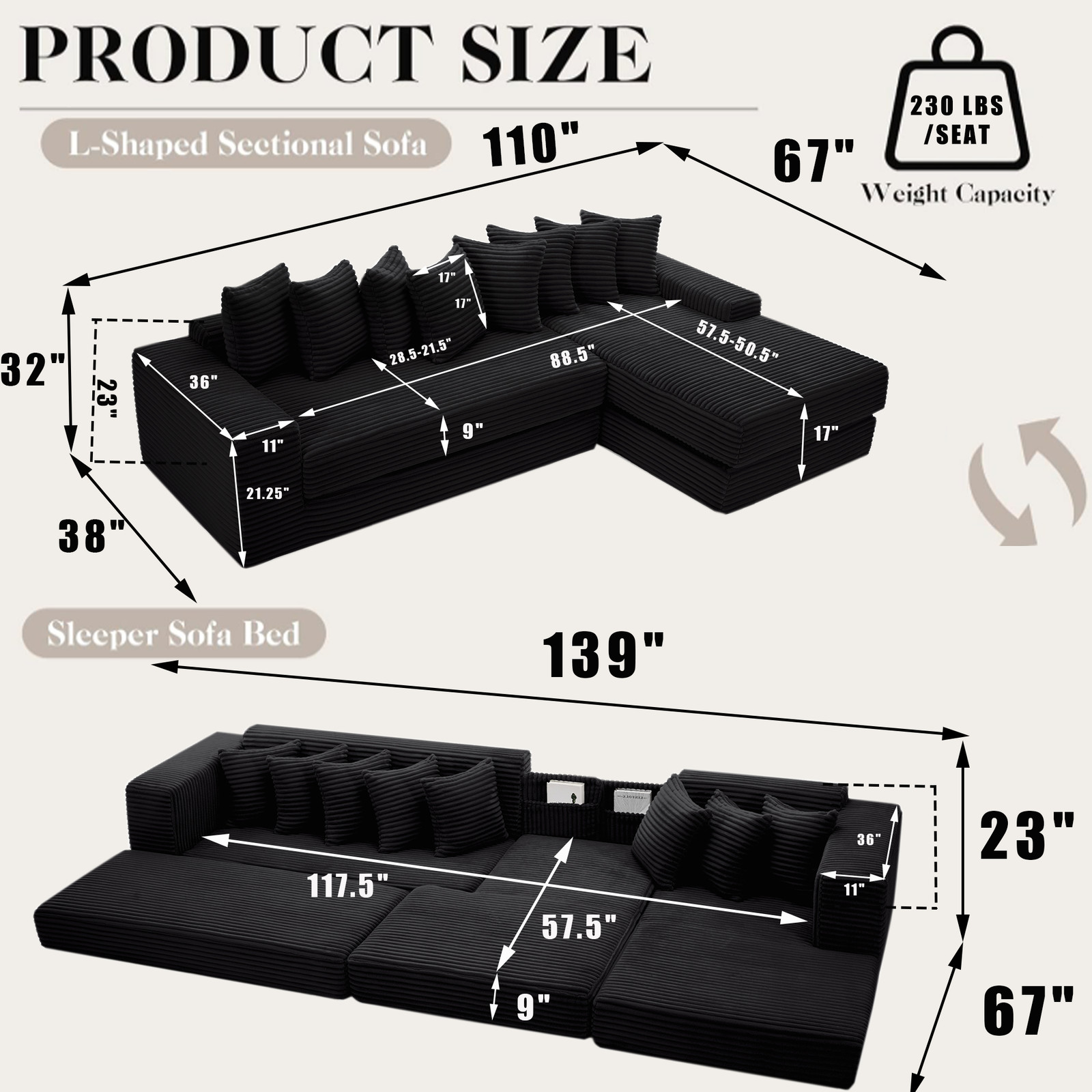 110 Oversize Cloud Sectional Couch,4 Seater L-Shape Sofa,Convertible Floor Sofa