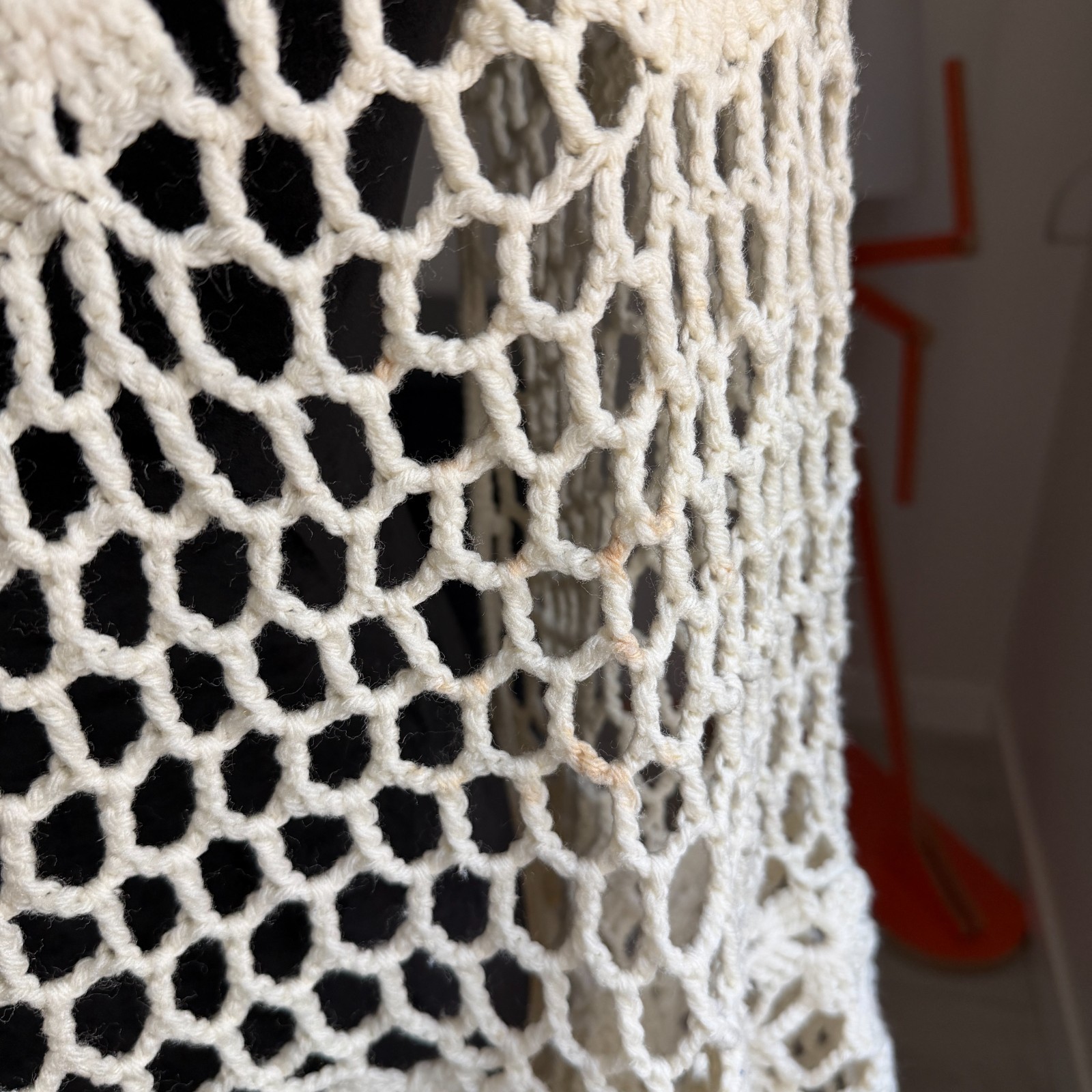 как выглядит Vintage Hand Crochet White Cream Shawl Wrap With Fringe Boho Gypsy Hippie Funky фото