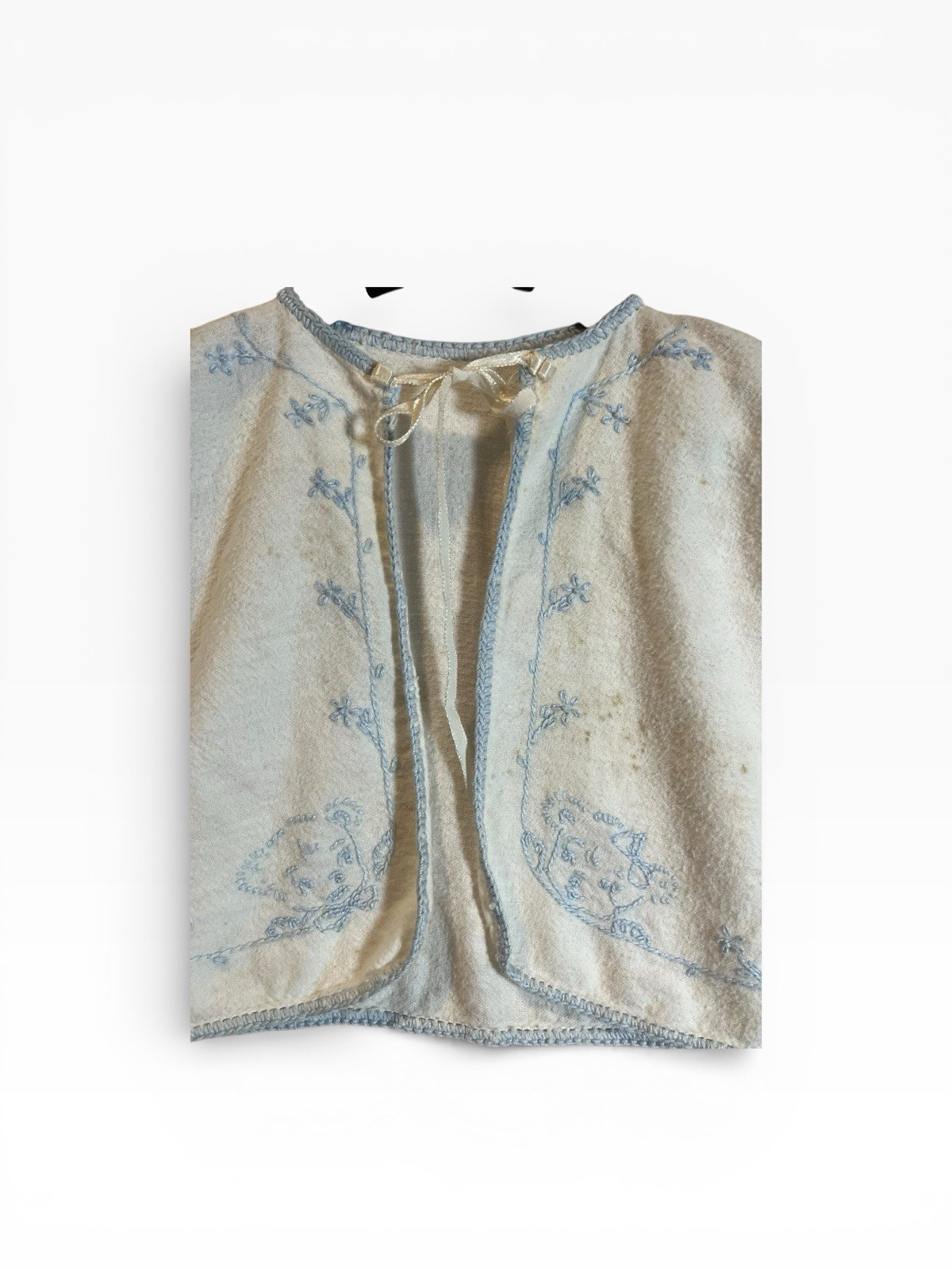 Vintage Baby Dressing Jacket Embroidered Sweater Ribbon Tie Front- Handmade 0-6M