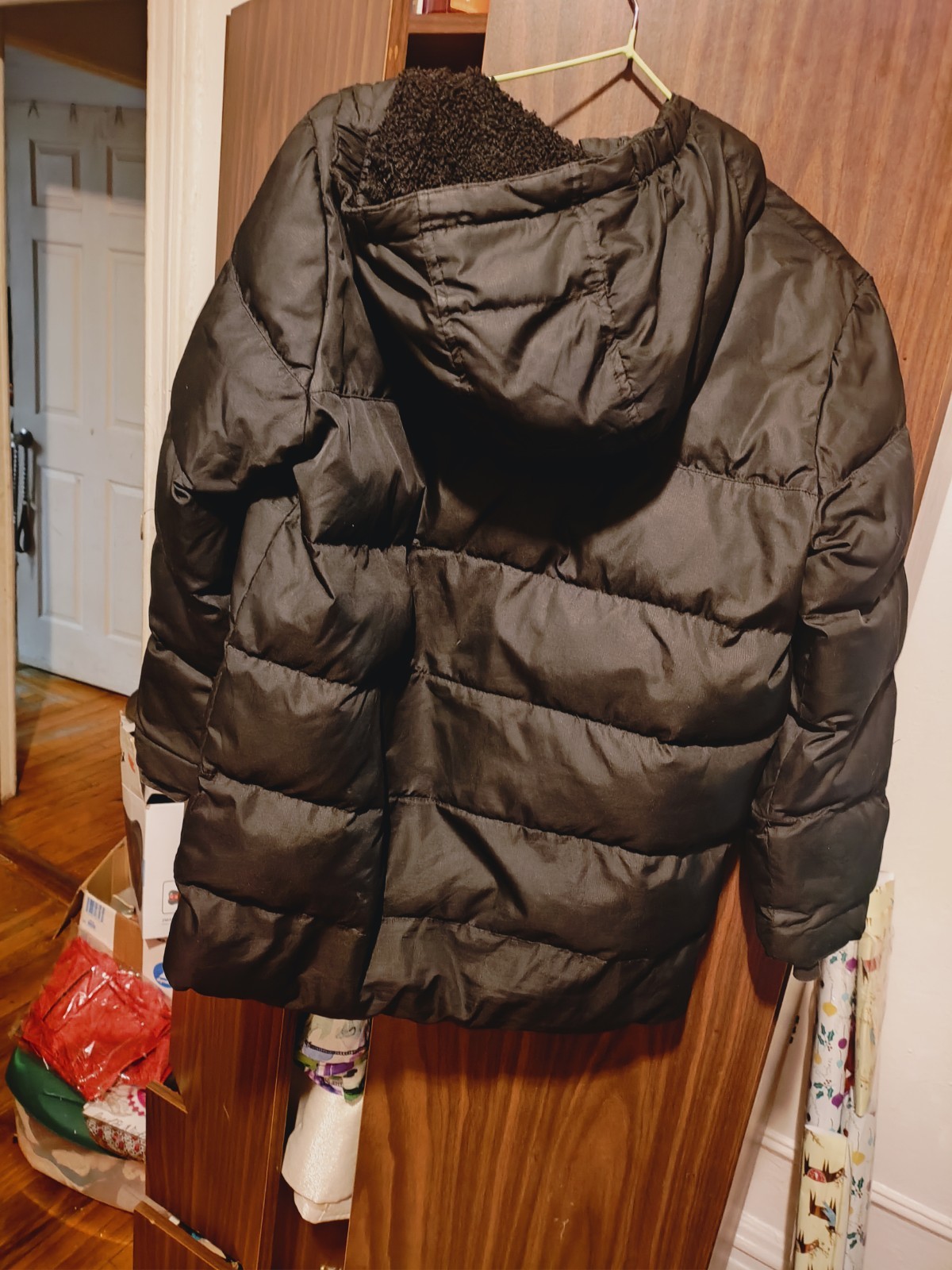 как выглядит Boy Or Girl LandsEnd kids Black coat with lining hood size large 10/12 used фото