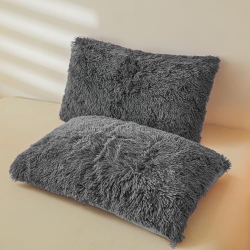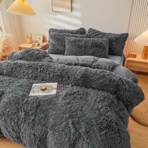 Fluffy Faux Fur Comforter Cover Set Fluffy Fuzzy Plush Bedding Queen Dark Grey