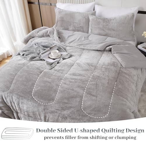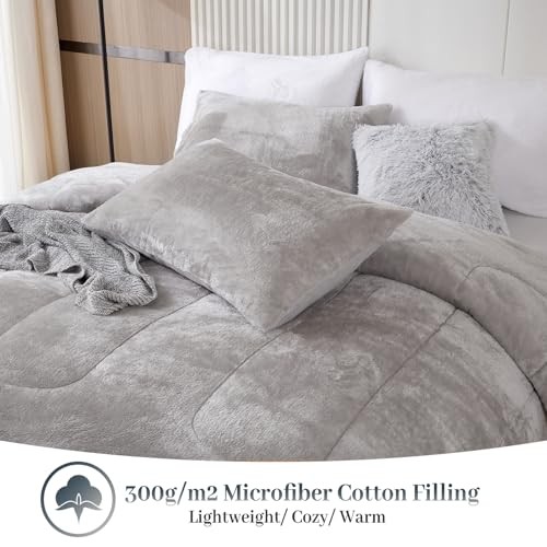 Faux Fur Size Comforter Set, Luxury Ultra Soft Fluffy Queen Light Grey