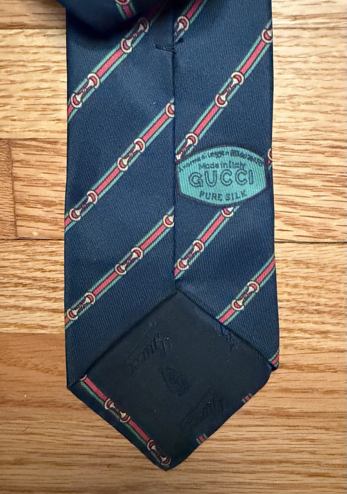 Vintage Gucci Silk Tie GG Navy Red Green Made In Italy 74x3.25 70s 80s Horsebit