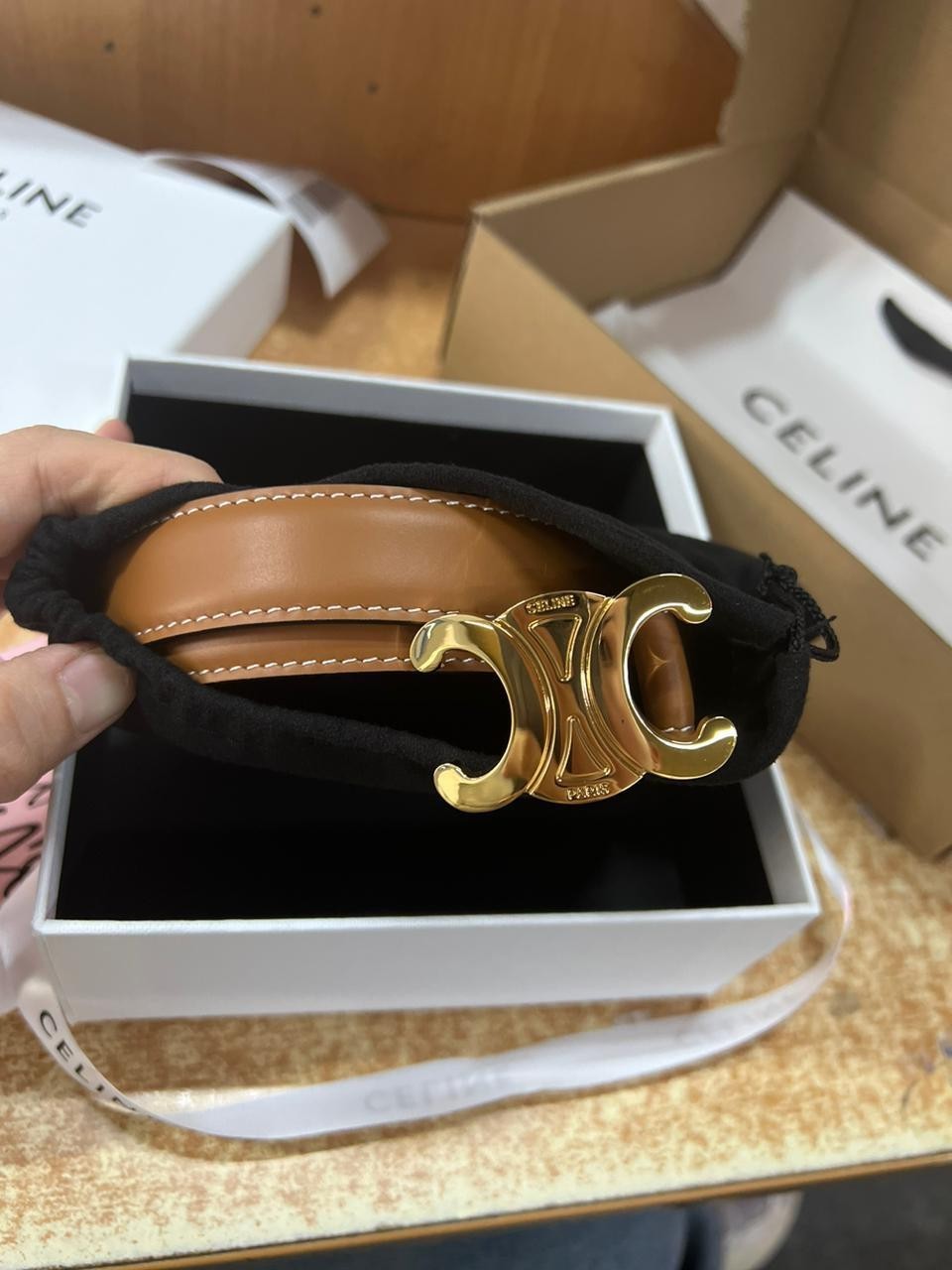 как выглядит CELINE MEDIUM TRIOMPHE BELT IN NATURAL, BROWN CALFSKIN YELLOWISH BROWN BELT 85 фото