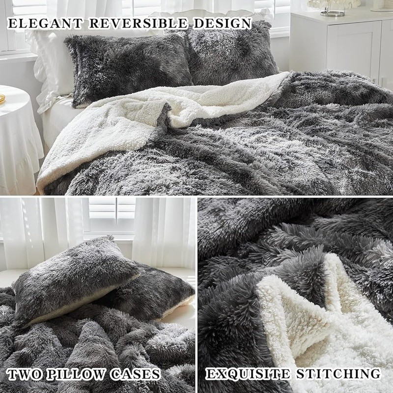 3-Pcs Plush Shaggy Comforter Set King Luxury Faux Fur Sherpa Reversible Bedding