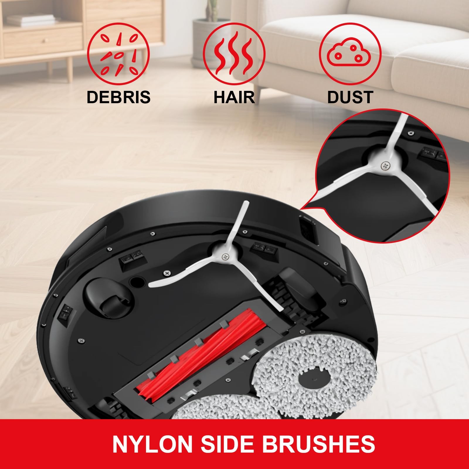 Included Components: Main Brushes, Side Brushes, Hepa Filters, Mop Pads, Dust Bags
