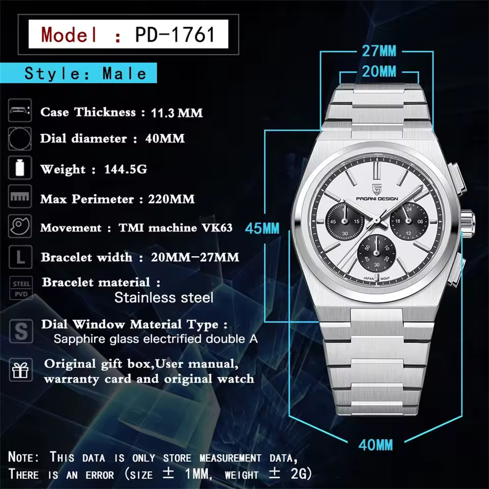 USA PAGANI DESIGN PD-1761 VK63 40mm Mens Chronograph Quartz Black