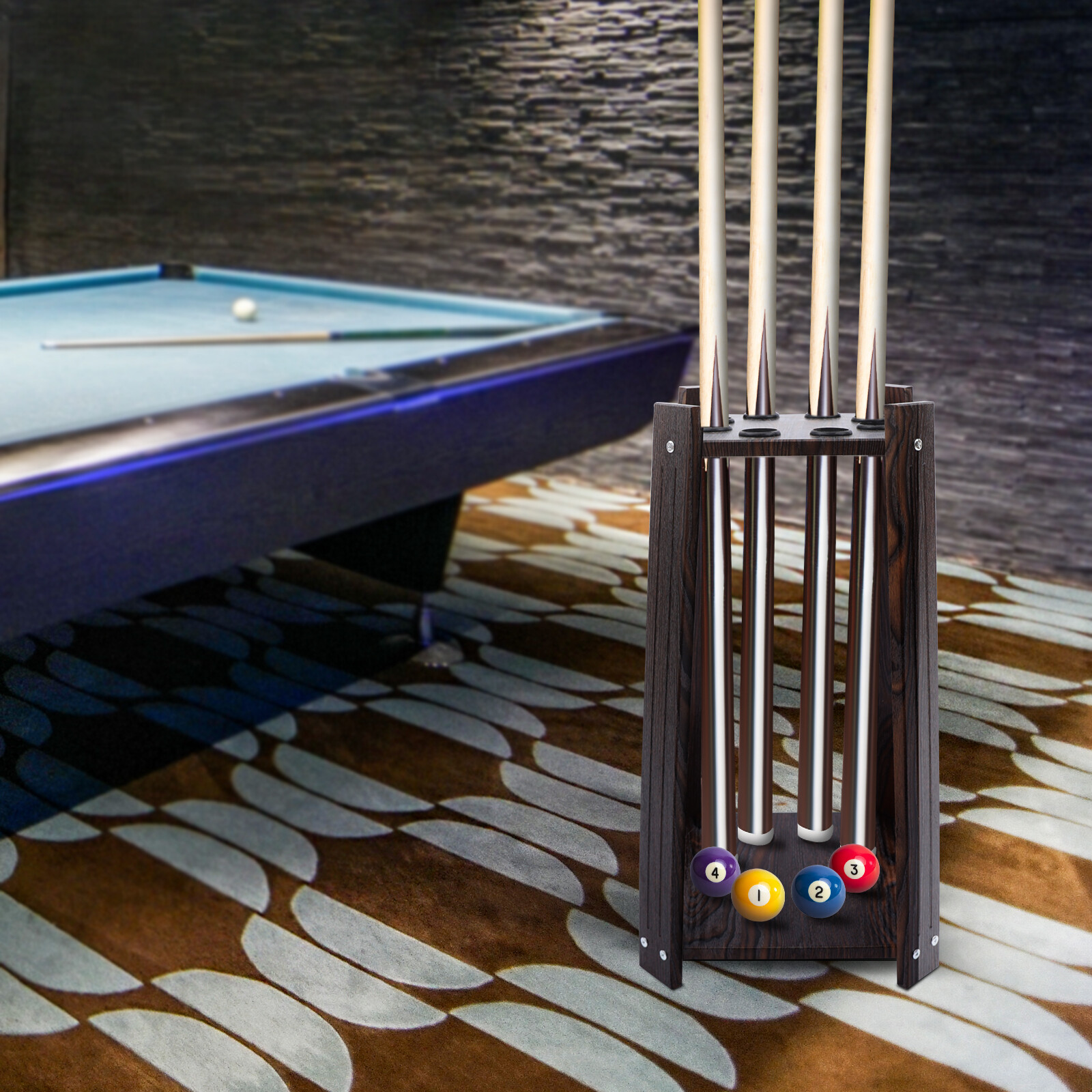 как выглядит Brown Retro 8-Hole Wood Pool Stick Stand - Multifunctional Storage Solution фото