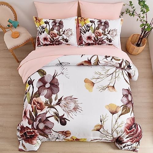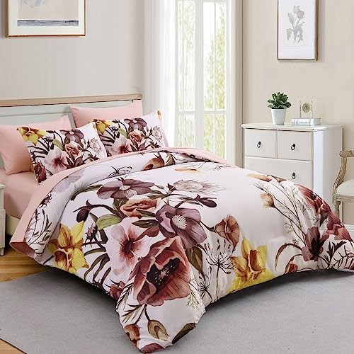 Floral Comforter Set 7 Piece Flower Bed in a Bag, Elegant Queen Size Blush