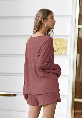 Pajama Set for Women Waffle Knit Lounge Sets Long Sleeve Top Large Rose Red