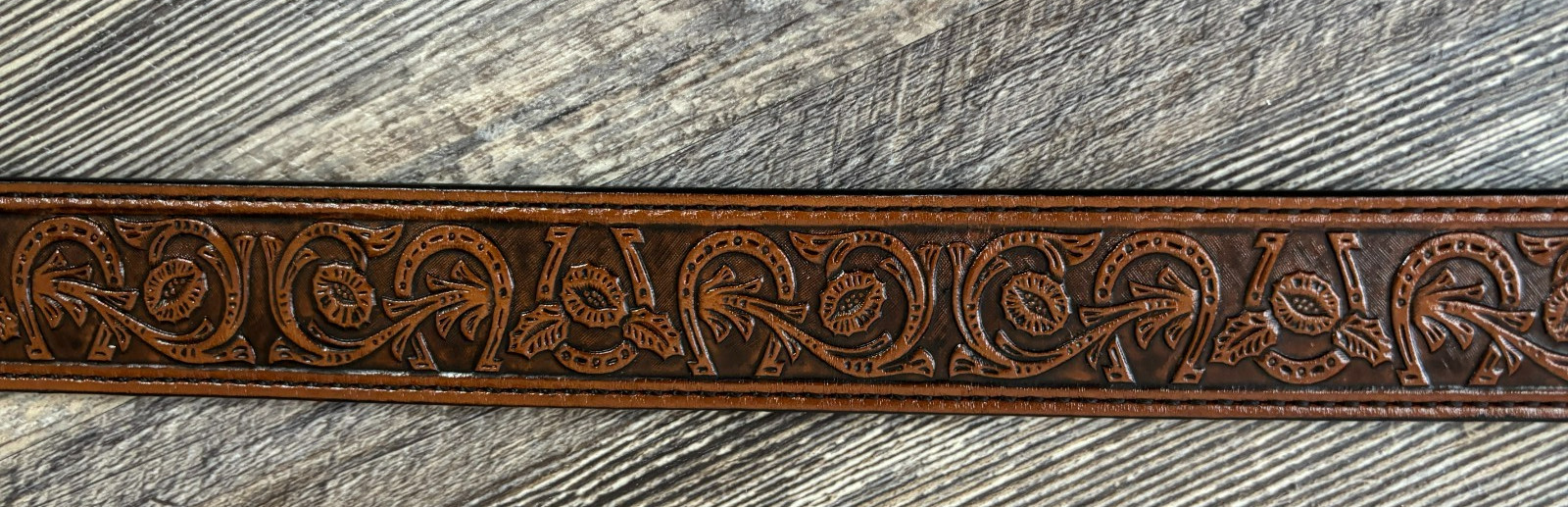 • CRUMRINE Western Belt Buckle 2 Horses w/Tooled Leather Belt USA Silver/Gold NEW