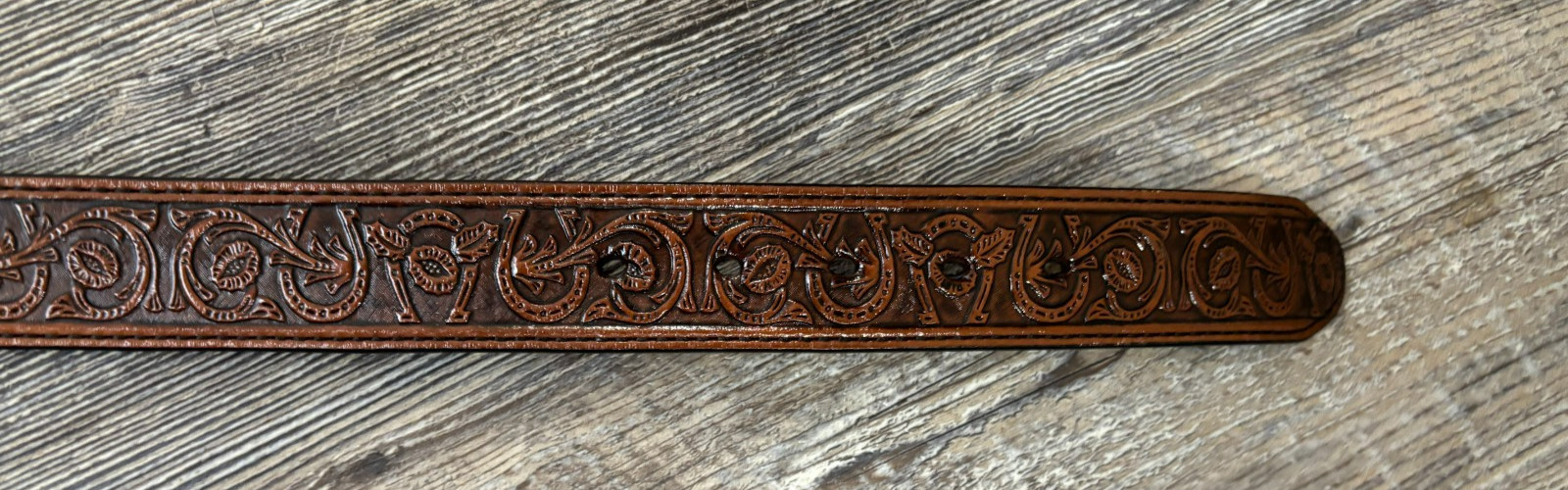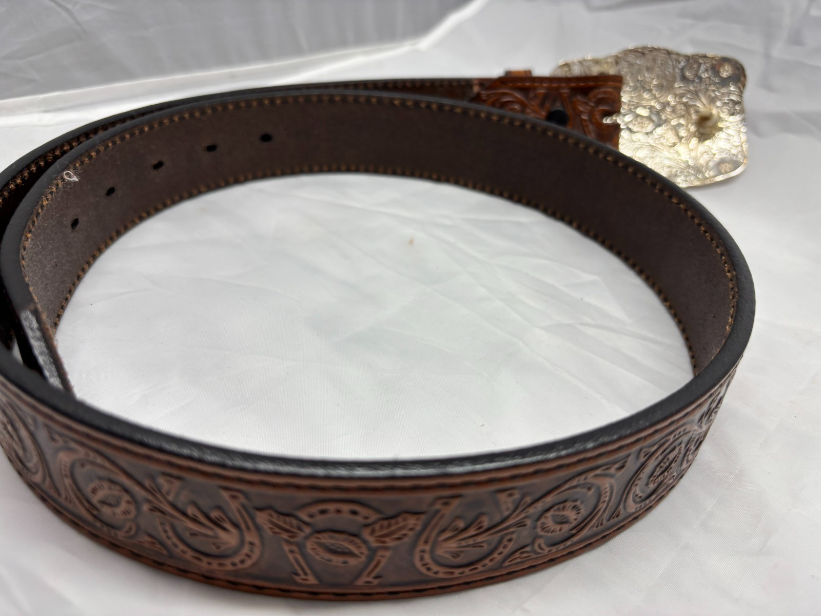 как выглядит CRUMRINE Western Belt Buckle 2 Horses w/Tooled Leather Belt USA Silver/Gold NEW фото