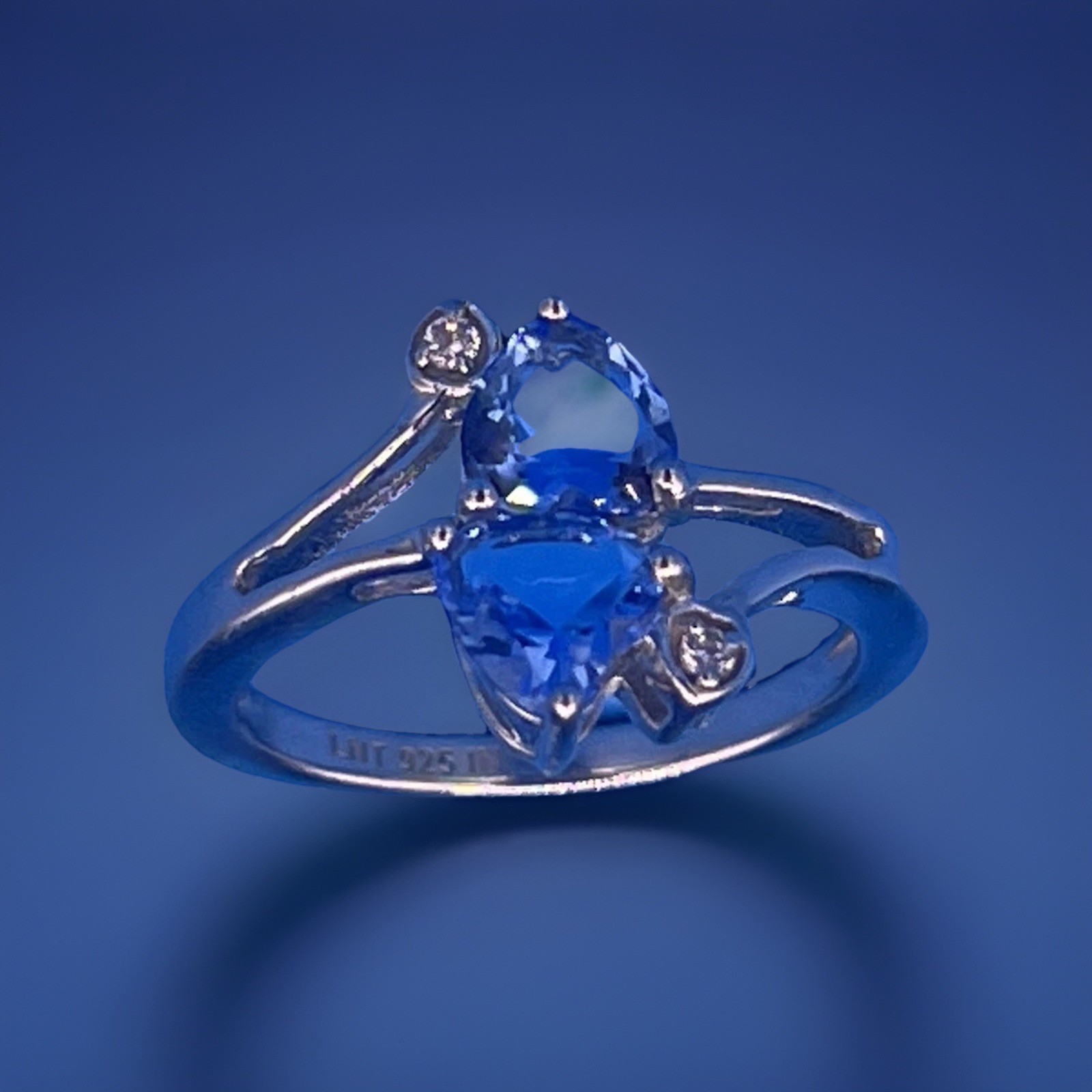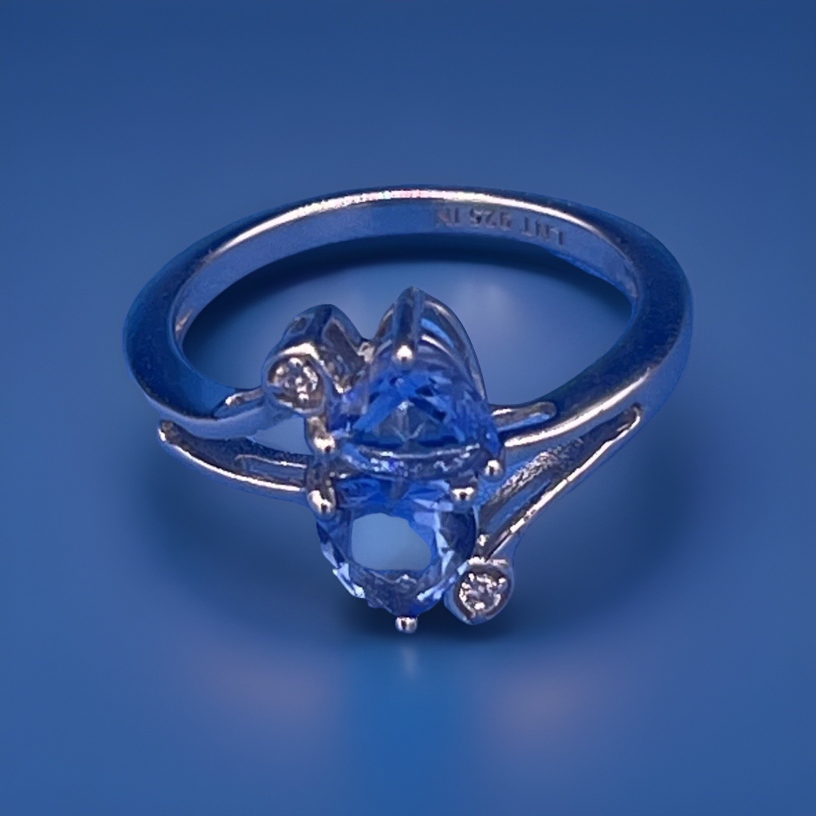 925 Sterling Silver Ring Blue Heart Gemstones w/ Clear Accent Stones Split Shank